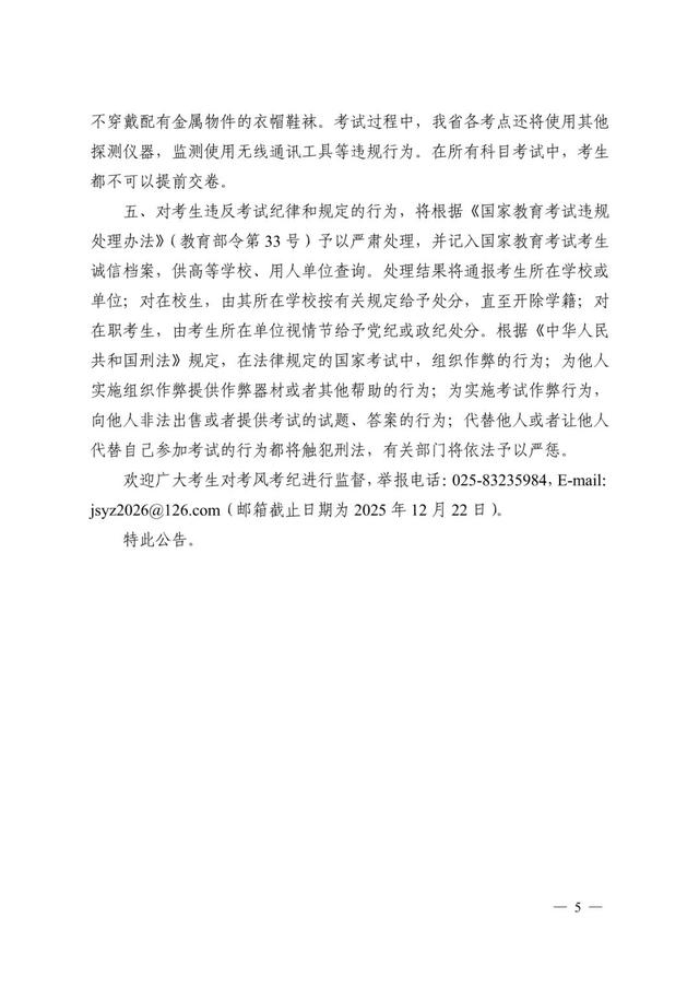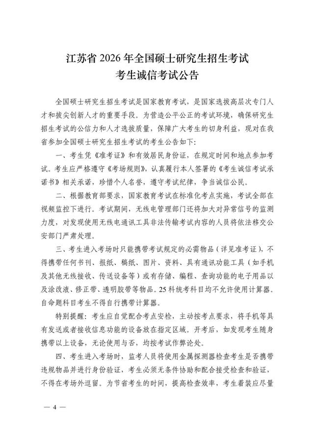所有考生须认真阅读并遵守考场规则及江苏省2026年全国硕士研究生招生考试考生诚信考试公告。