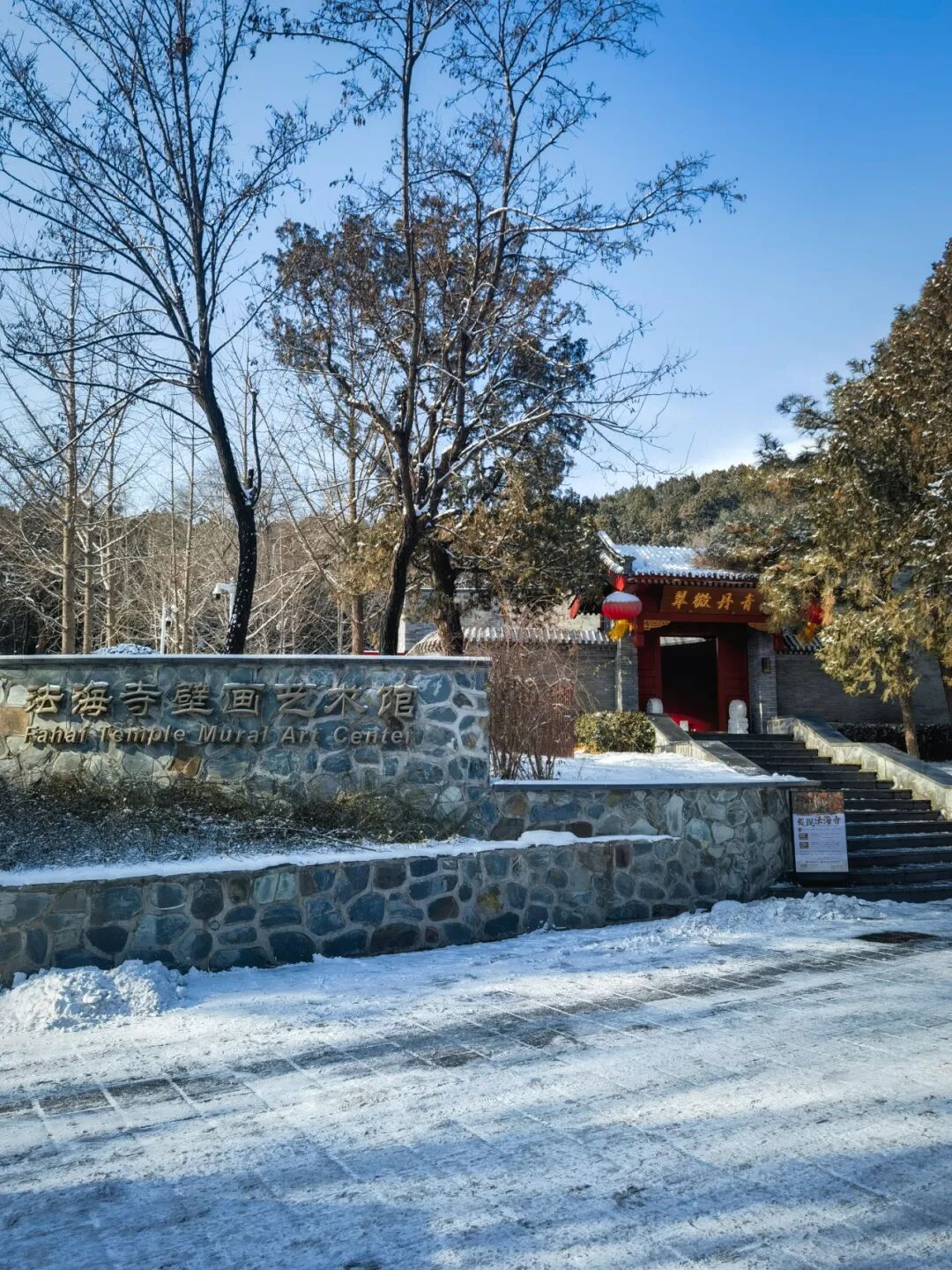 松柏凝霜,屋阁覆雪,法海寺壁画艺术馆静立于一片澄明素净之中。六百年壁画与数字科技相遇,古朴风韵与现代美学交融,织就成一幅冬日画卷。