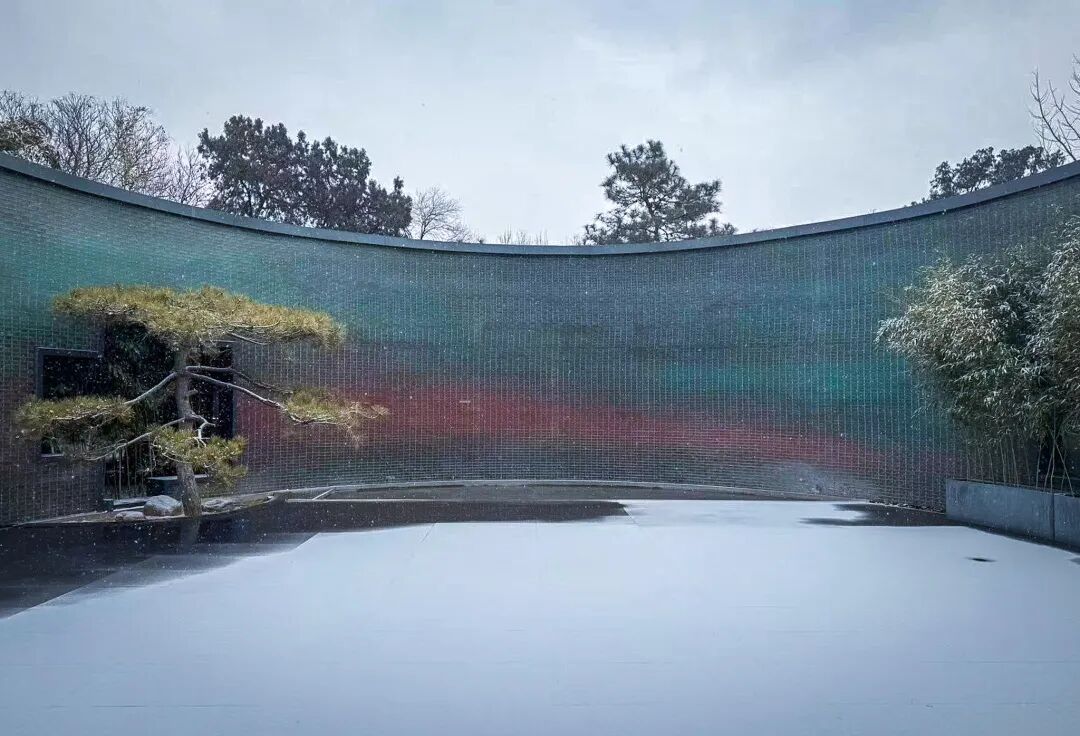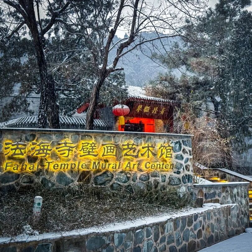 法海寺壁画艺术馆坐落于模式口大街,既保留了传统院落风格,又巧妙融入了现代艺术空间设计。积雪轻覆屋檐与古木松柏之上,与建筑相映成趣,宛如一幅水墨之境。