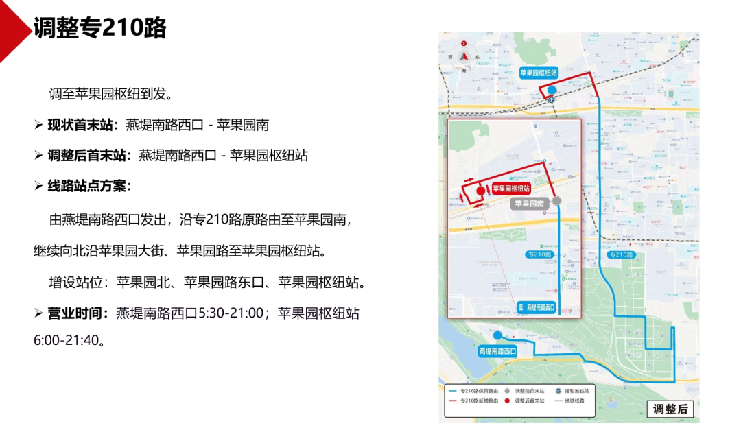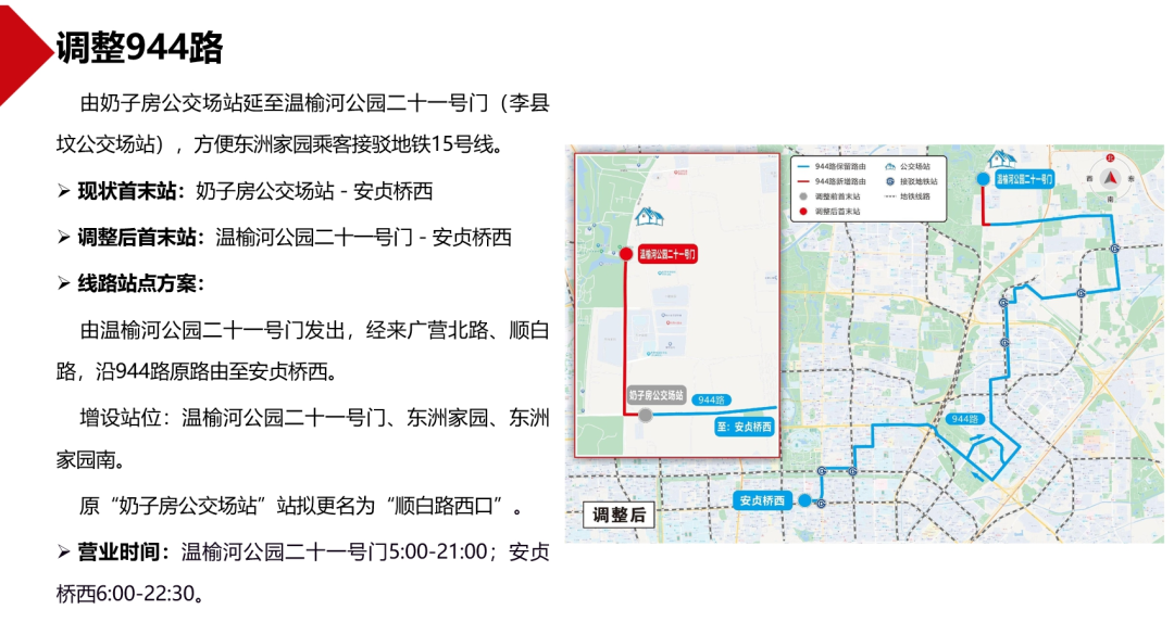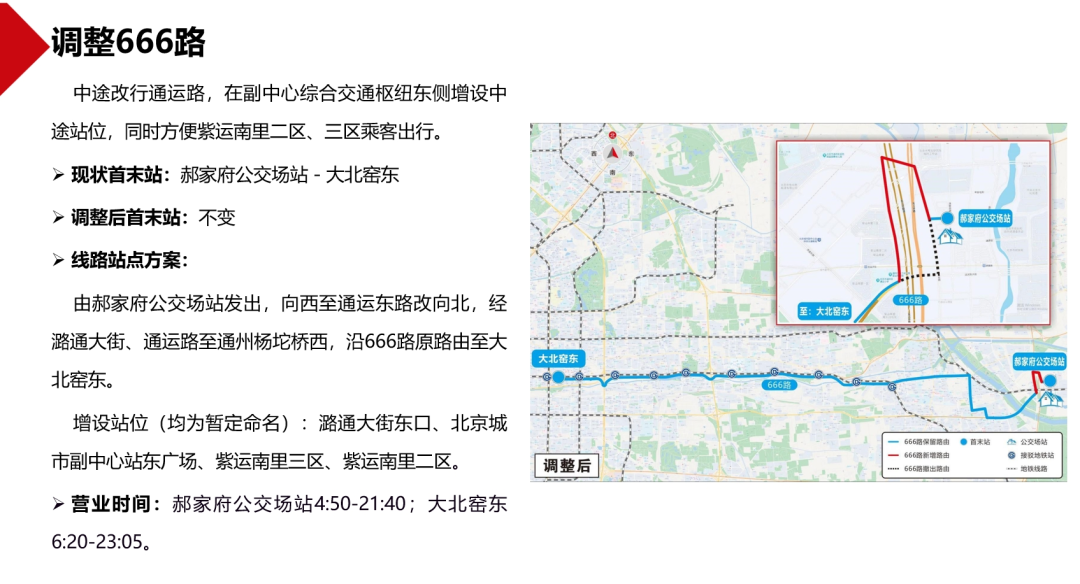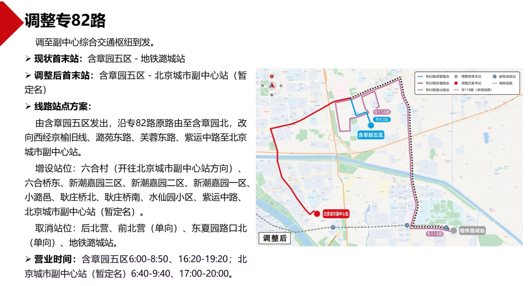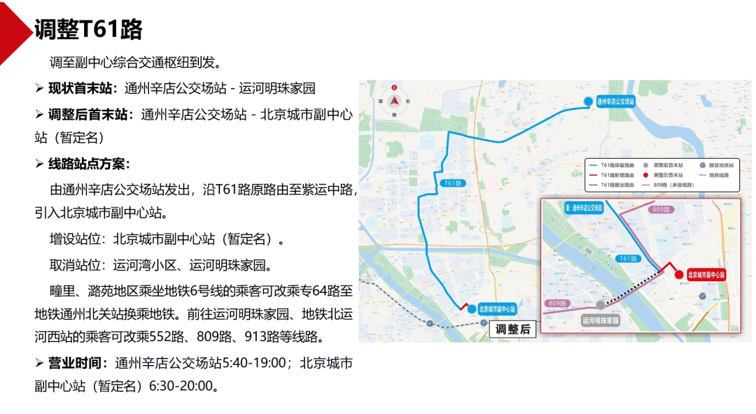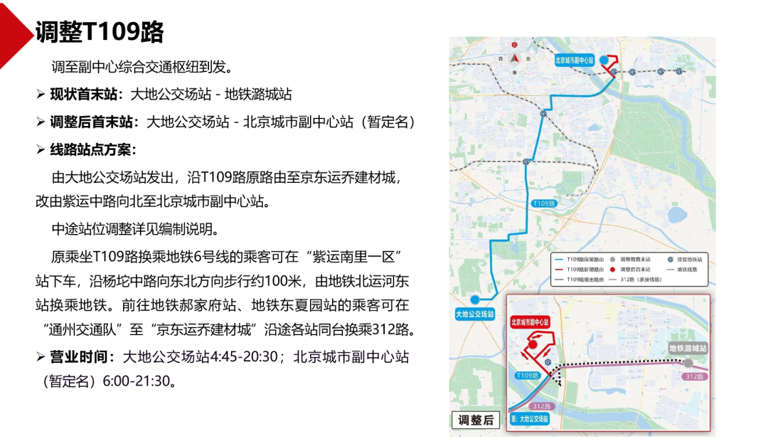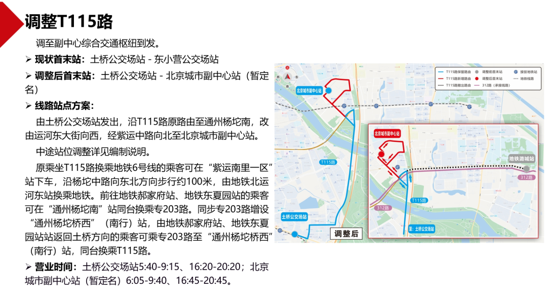 为做好副中心综合交通枢纽、苹果园枢纽公共交通运输服务,市交通委组织公交集团制定了公交线路进驻方案。调整T109路、T115路、T61路、专82路至副中心综合交通枢纽;调整666路,在副中心综合交通枢纽东侧增设中途站位。调整专210路至苹果园枢纽。另配合奶子房公交场站疏解腾退,调整944路。现对上述7条公交线路优化方案网上公开征求意见,欢迎社会各界提出意见建议。
