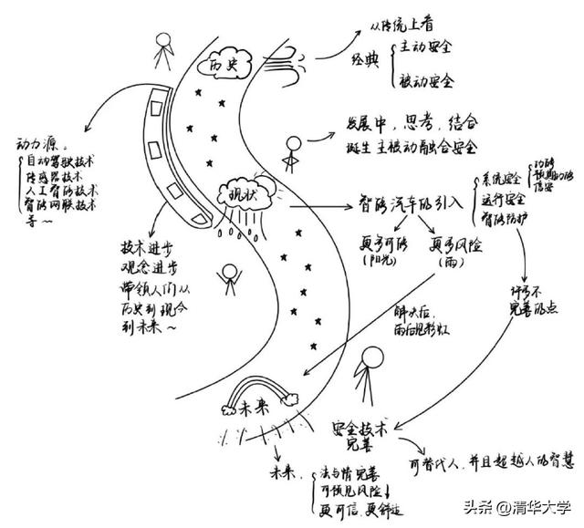 有一次,聂冰冰在课上留下一道开放式作业:“请用一种你喜欢的方式,画出你心中的智能汽车安全。”有一位同学的作品令她至今印象深刻:风雨中,一辆车穿过阴云,驶向彩虹。这一列车代表着汽车安全领域从历史走向未来,从纯技术意义上的安全观走向“法与情的完善”。