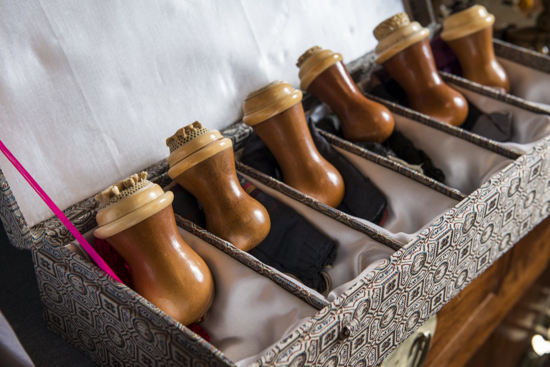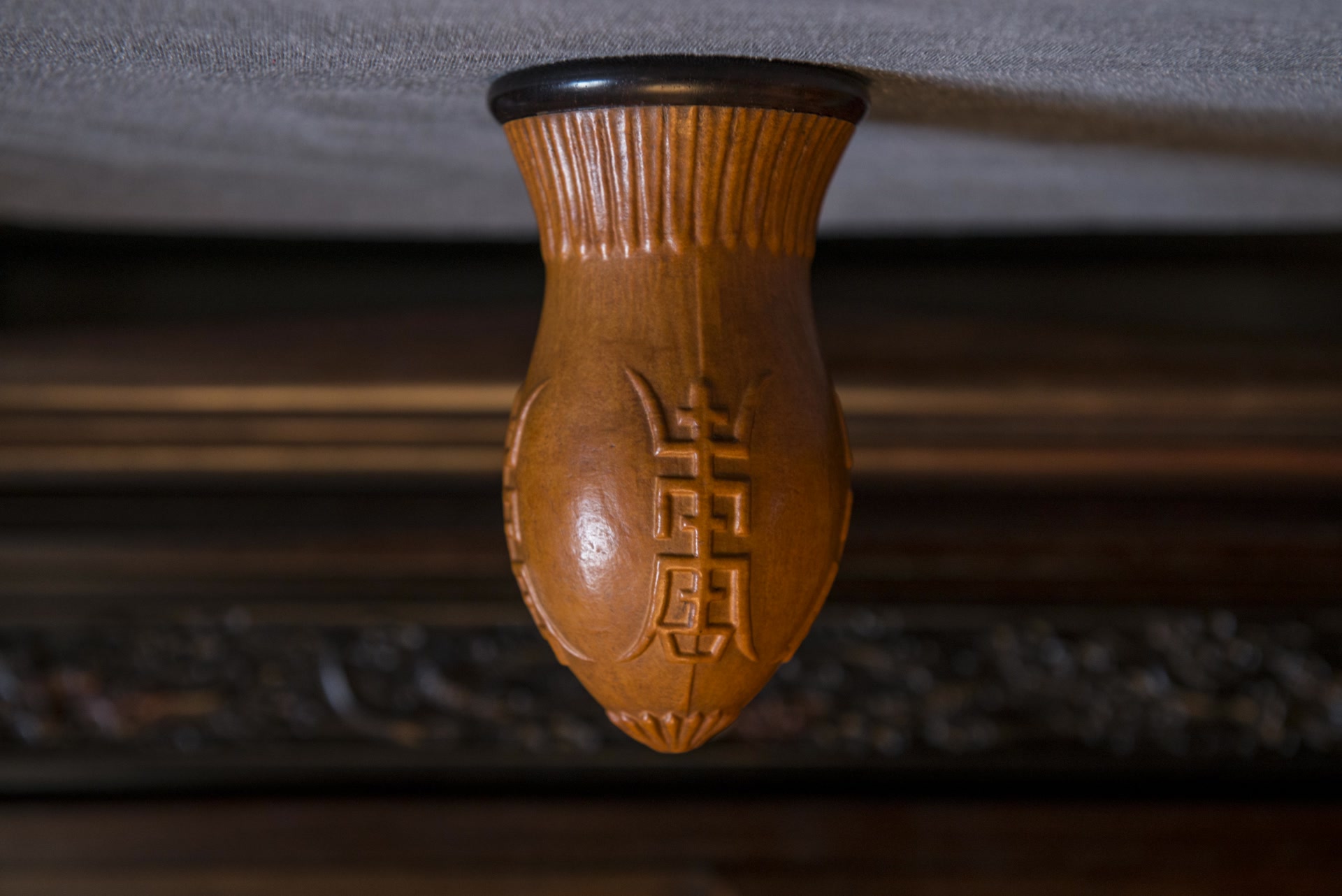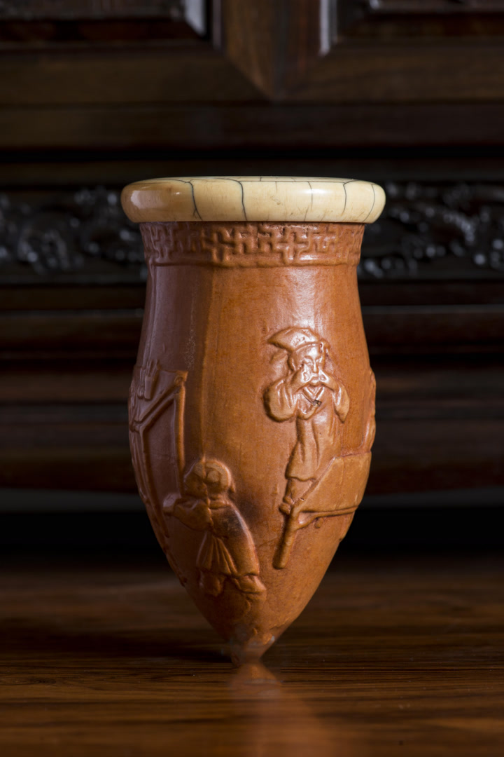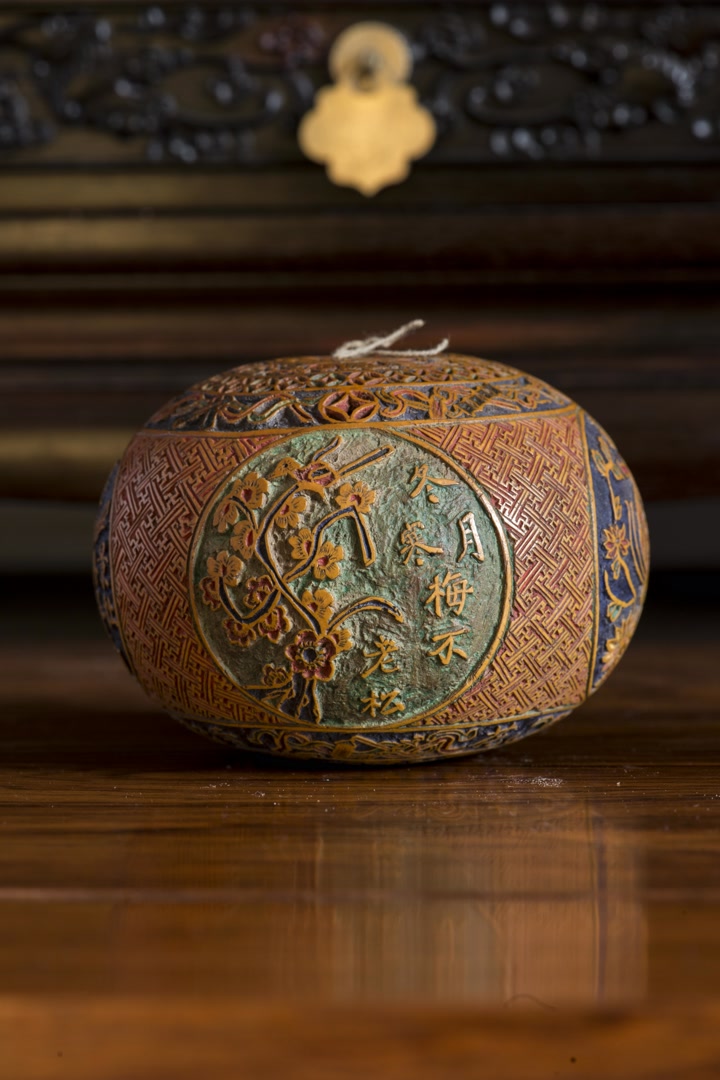 马洪泉先生收藏的匏器是在全国各地淘来的,包括养各种鸣虫的匏器及虫具,器型多,老匏器多,收藏品中有著名的“三河刘”,有“官范”的,也有“民范”的。范,是指匏器的范制技艺,有素模的,即是范制出的匏器没有纹饰;也有花模的,就是范制出的匏器上有纹饰。
