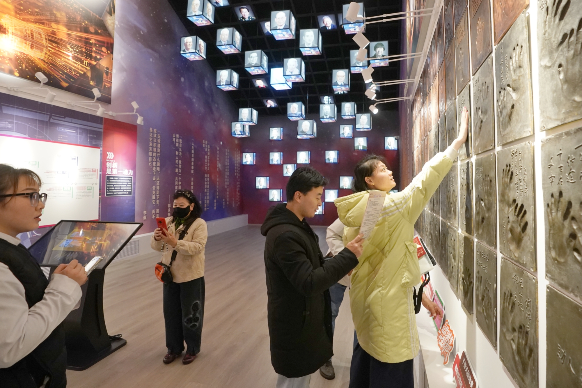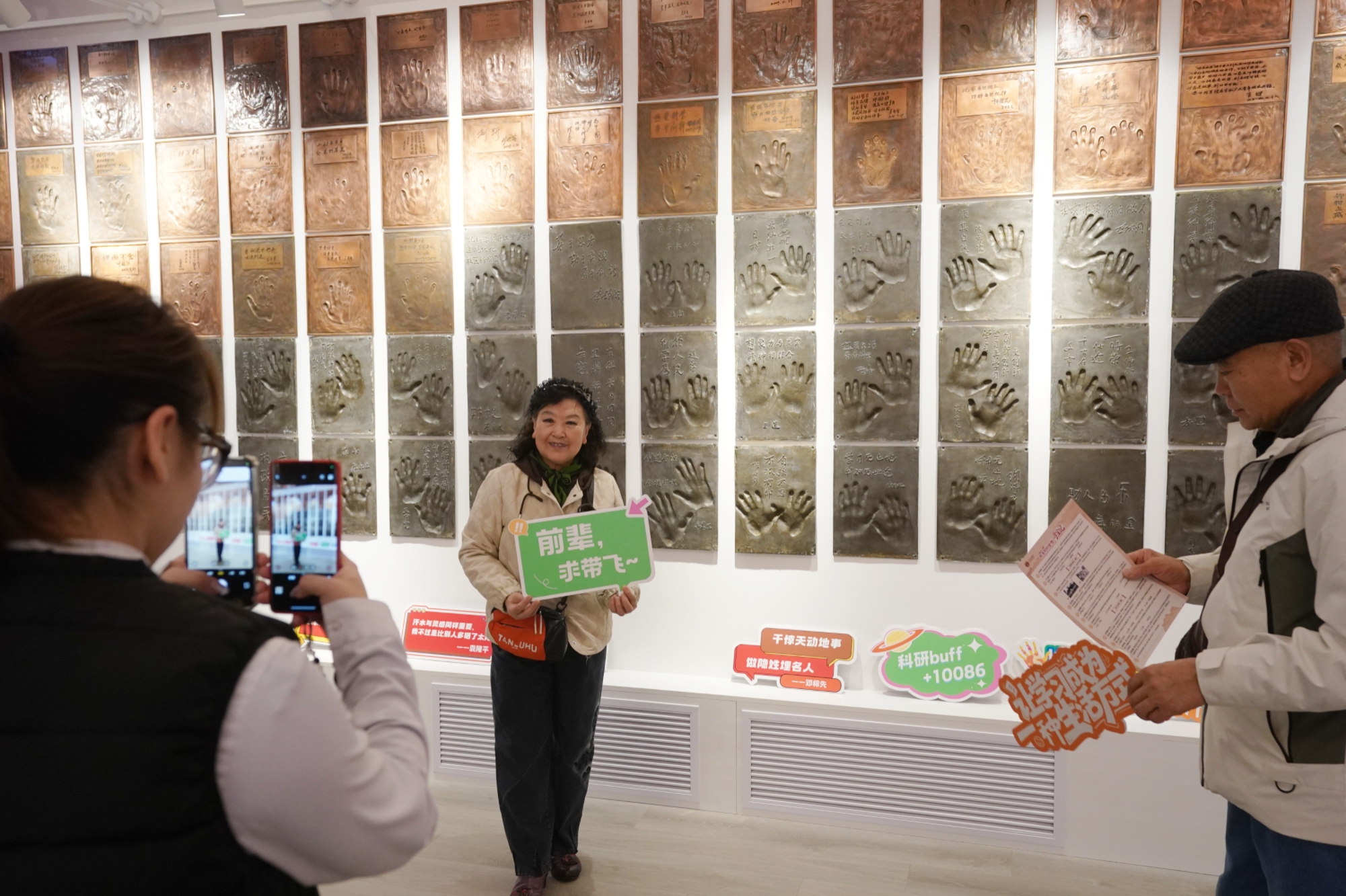 在二层“科技星光”展区,“Hi,five!与科学击掌”互动成为各年龄段的打卡首选。伸手贴合院士手印的瞬间,仿佛与科学巨匠完成了一场跨越时空的“击掌”,随即拍照留念并附上#中关村村史馆五周年#话题,分享至社交媒体,传递科学精神的当代共鸣。