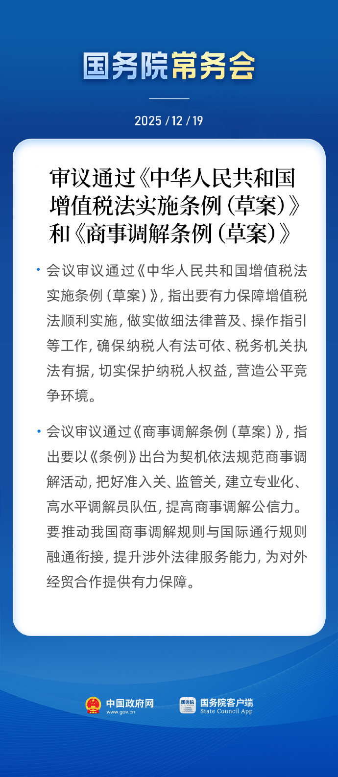 国务院常务会审议通过《中华人民共和国增值税法实施条例(草案)》和《商事调解条例(草案)》