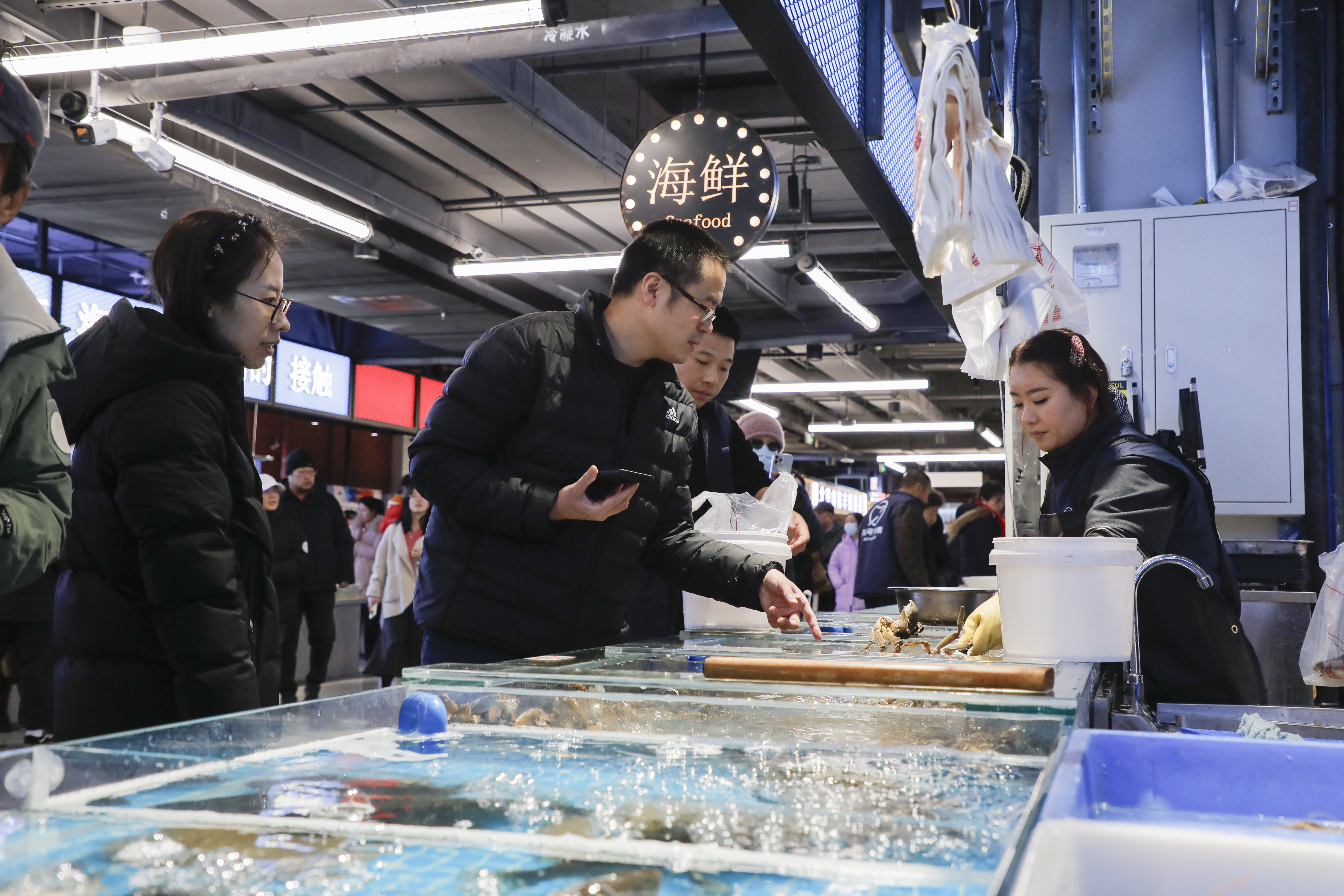 走进市集一层,生鲜零售区的300多个柜台上,新鲜的蔬菜瓜果、品类丰富的生鲜肉类、鲜活肥美的海鲜,还有主食面点、散装熟食、烘焙糕点等琳琅满目,不少顾客在柜台前排队选购。这里涵盖六大类、千余种商品,还有稻香村、天福号、六必居等老字号食品出售。家住西坝河中里社区的张大妈提着满满一兜食材说:“现在全家人想吃什么,家门口的市集一站式就能买全,对周边社区的居民来说,方便多了!”