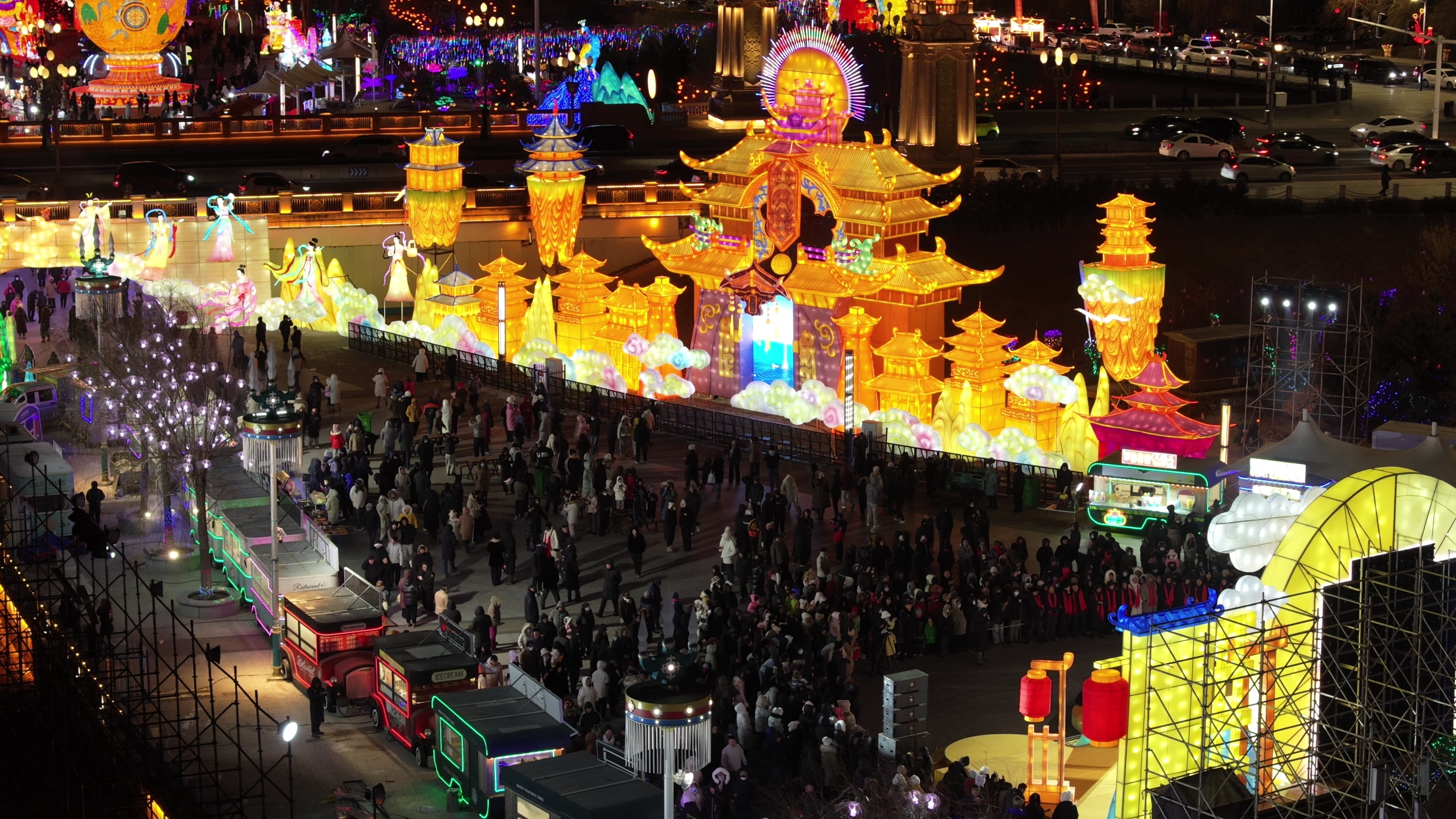 此次灯会以“跃马耀星河·迎春绘盛景”为主题,总投资500万元,精心打造40余组主题花灯,涵盖神话、民俗、童话等多重维度,以公园桥梁为界划分南北两大主题区域——北岸“天宫幻境”营造神话般的星河梦境,南岸“盛世人间”铺展热闹祥和的年俗画卷,勾勒出新春的美好图景。其中,《天马凌霄》灯组呼应马年祥瑞,象征昂扬向上、开拓进取的精神风貌,与灯会主题高度契合;《颗粒归仓》灯组以“中国碗装中国粮”的鲜明形象,象征丰收喜悦,传递粮食安全的家国根基;红火的《吉灯贺岁》灯组则满含新年祝福,点亮群众心中的美好期盼。“今天特意带家人来逛灯会,一进公园就被这些花灯惊艳到了,都做得特别精致,拍照特别出片,孩子也玩得特别开心,年味一下子就拉满了。”居民穆玲说道。