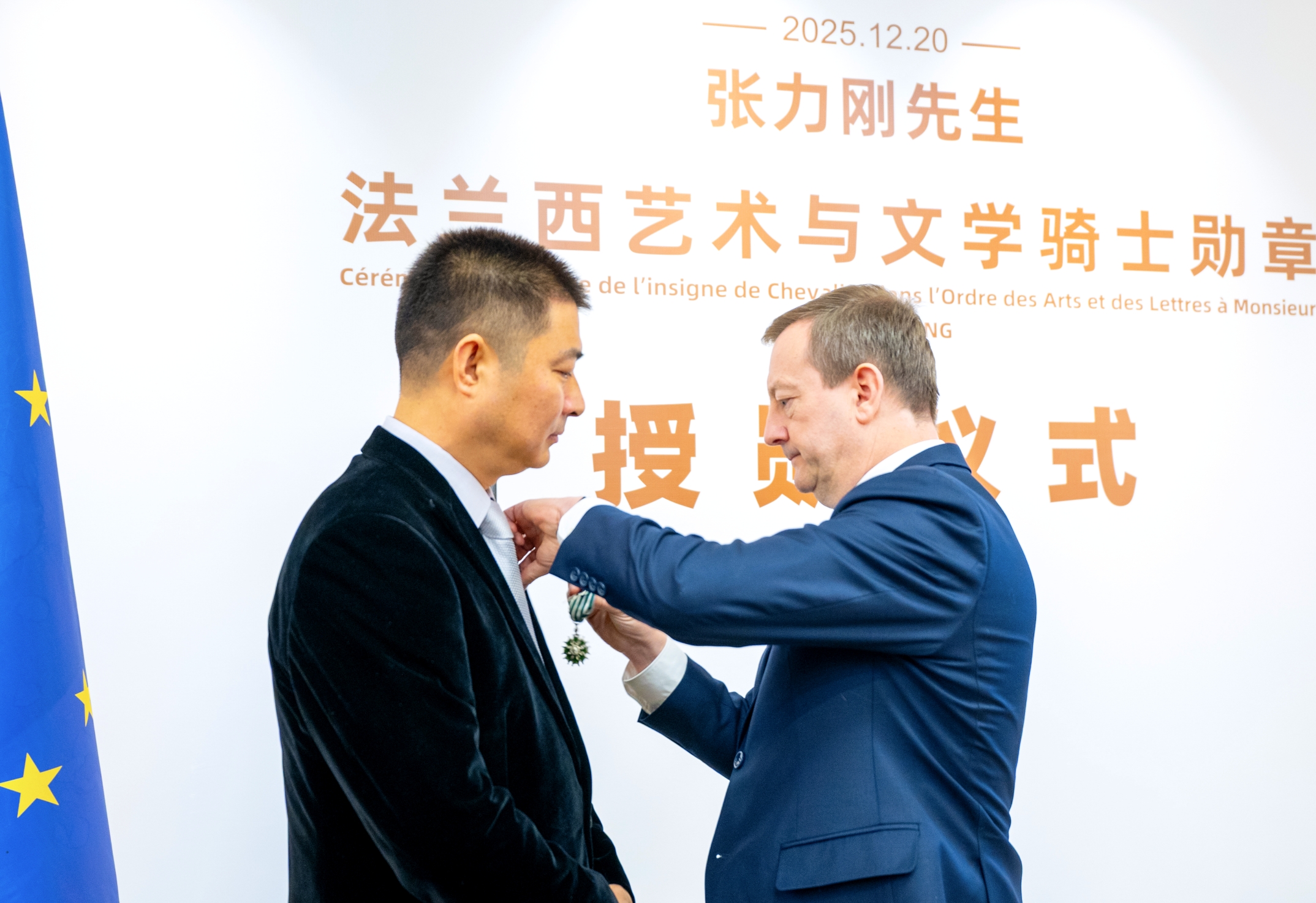 12月20日,法兰西艺术与文学骑士勋章授勋仪式于北京天桥艺术中心举行。法国驻华大使白玉堂代表法国文化部,向九维文化董事长张力刚授予勋章,表彰其在中法文化对话及法国文化在华传播领域的卓越贡献。