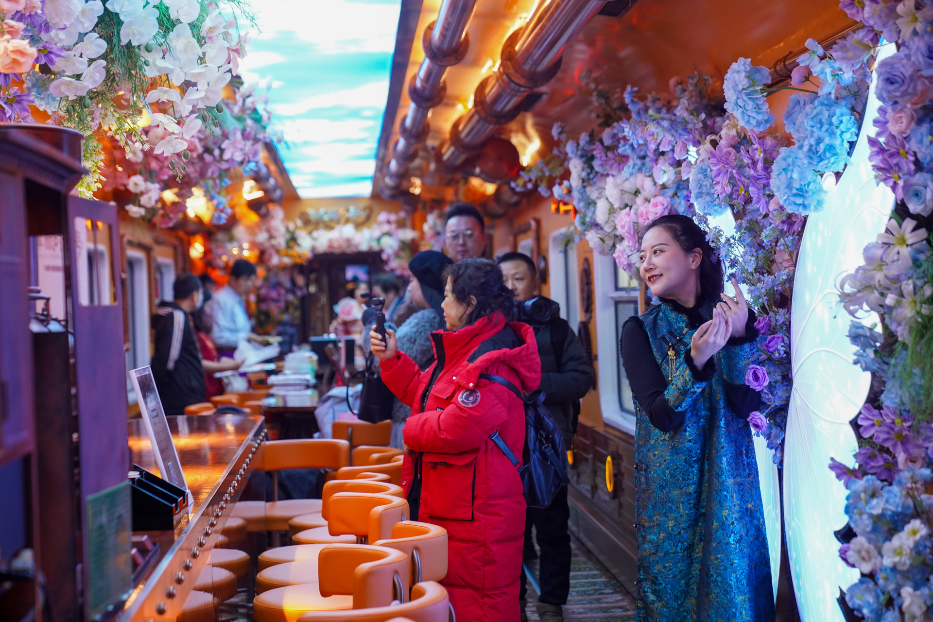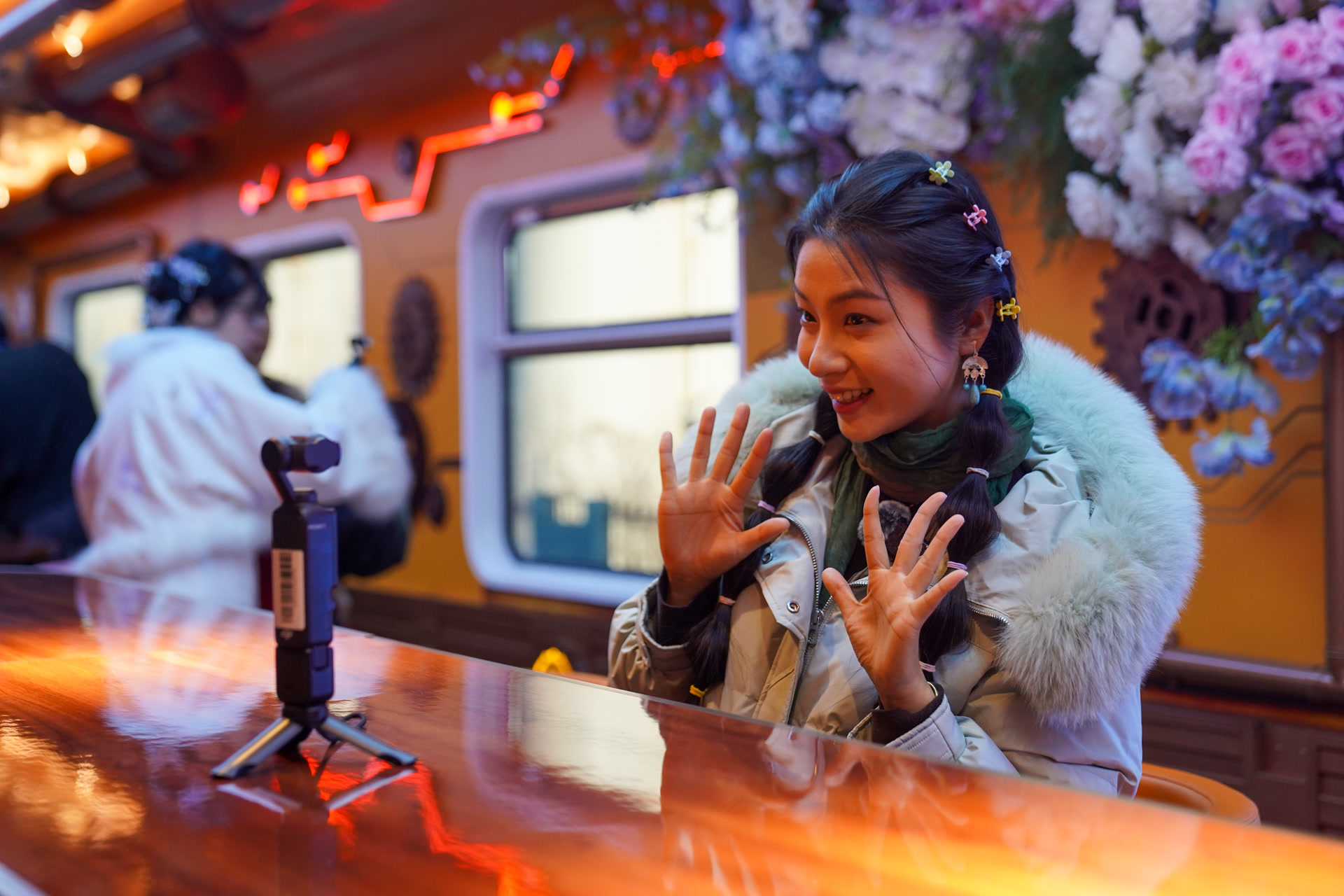 据介绍,升级后的“津旅时光号”由十节主题车厢组成,围绕客座区、VIP区和互动体验区三大功能板块进行布局,通过戏剧化空间设计与功能整合,使每节车厢兼具观演与互动属性,不同主题车厢协同运作,让旅途本身成为一段连续展开的沉浸式体验。