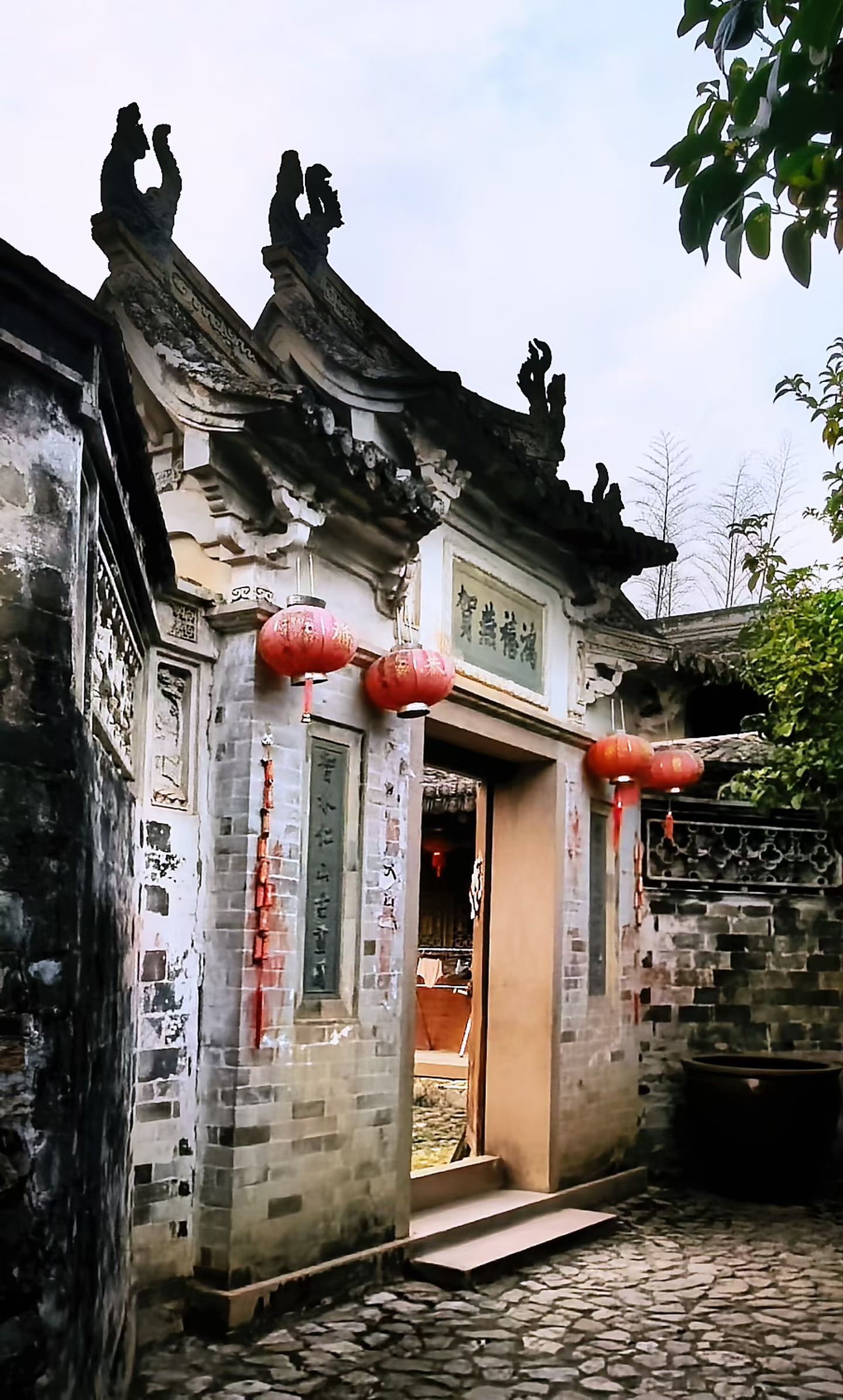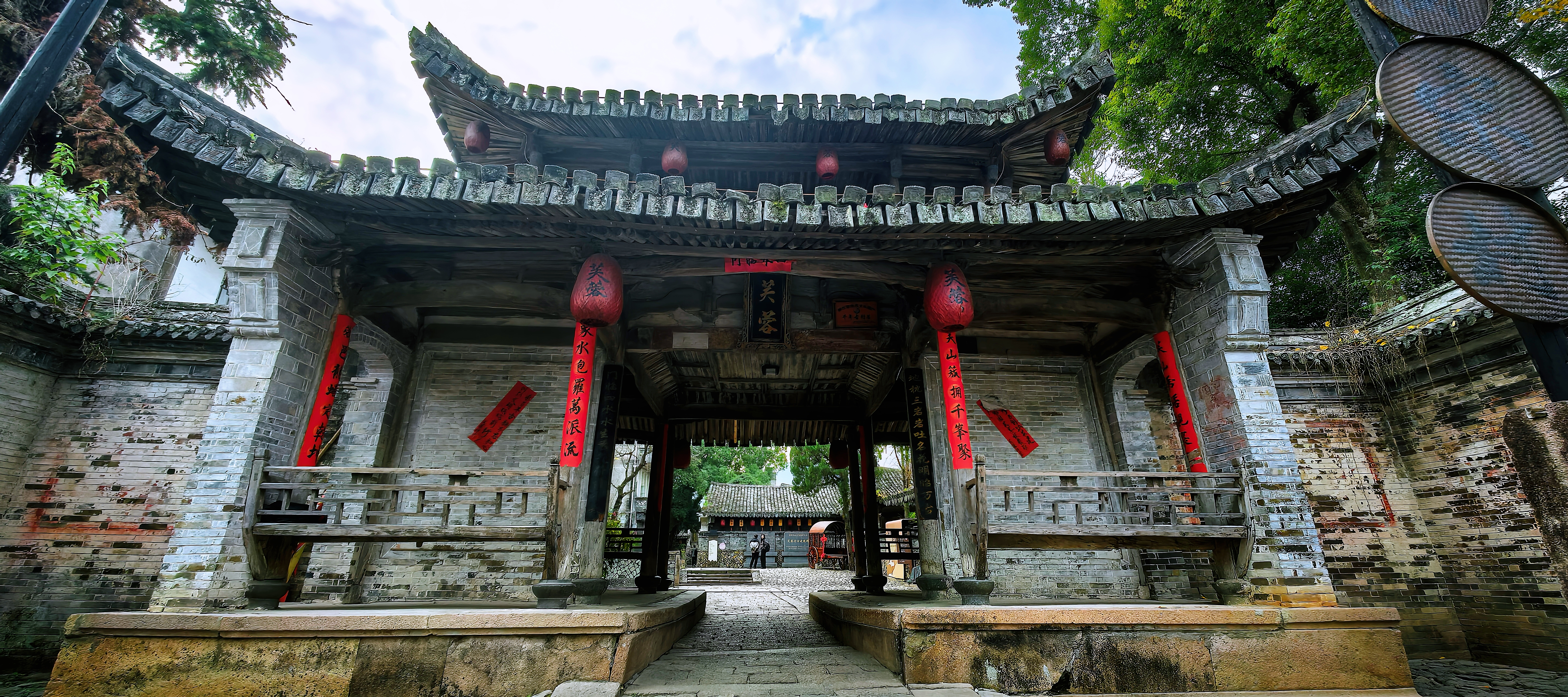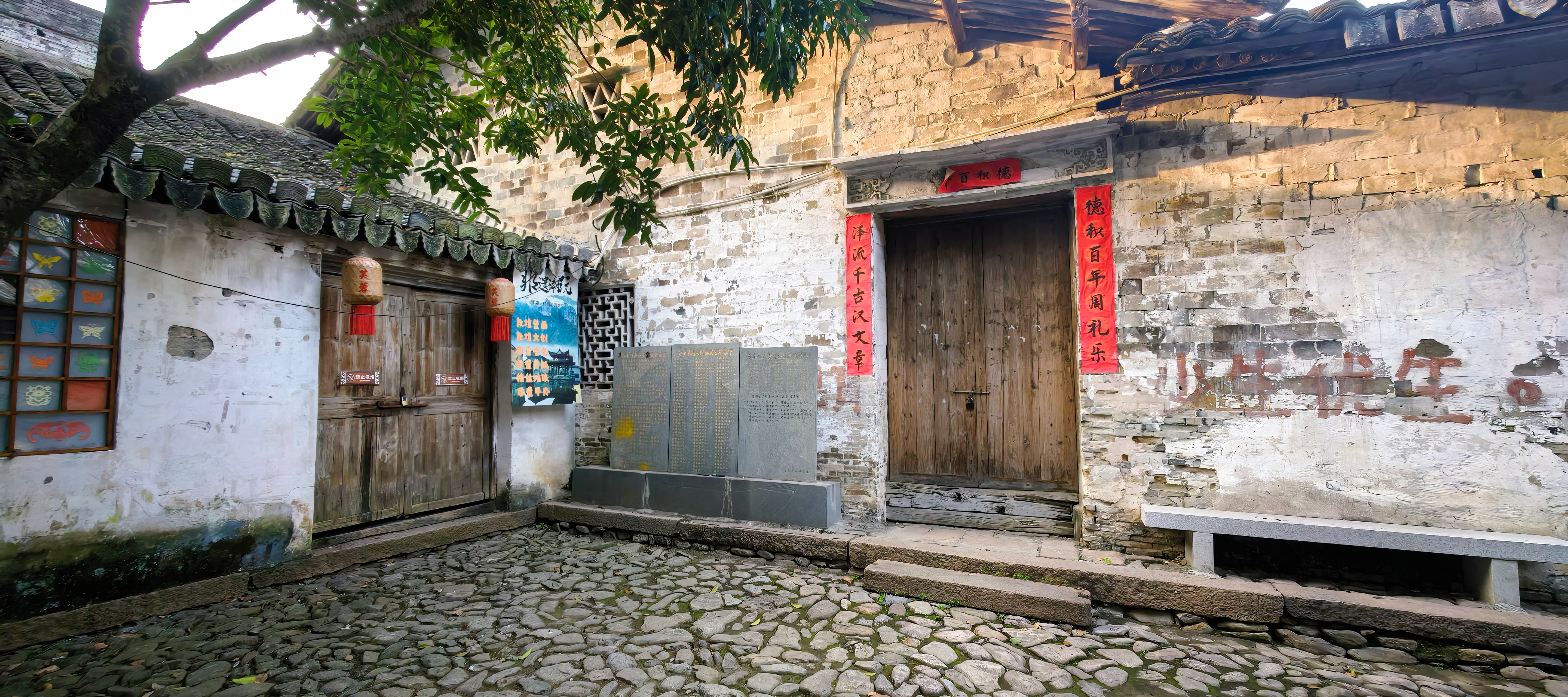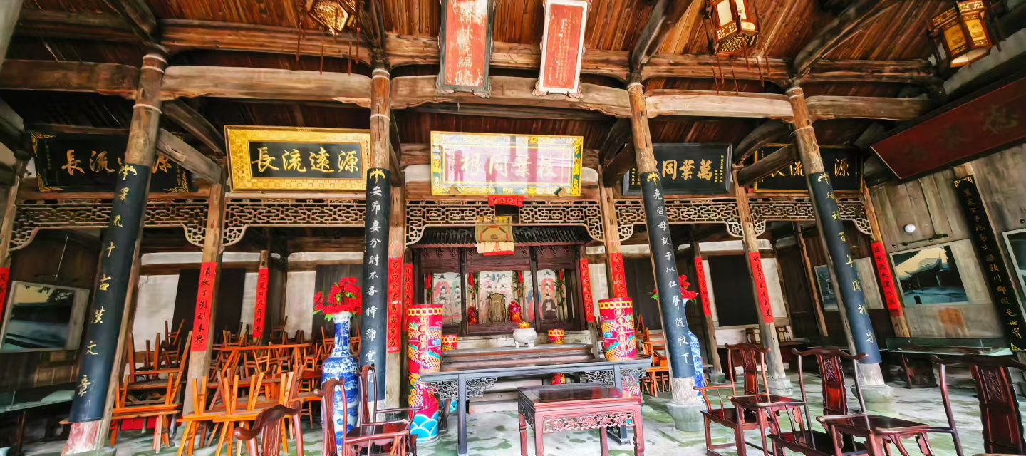 进东门北侧,便是陈氏大宗祠,它是古村建筑的精华所在。祠堂格局严谨,院内大戏台雕梁画栋,飞檐下的雕花在光影中更显精致,仿佛还能听见当年的丝竹之声与市井喧嚣。