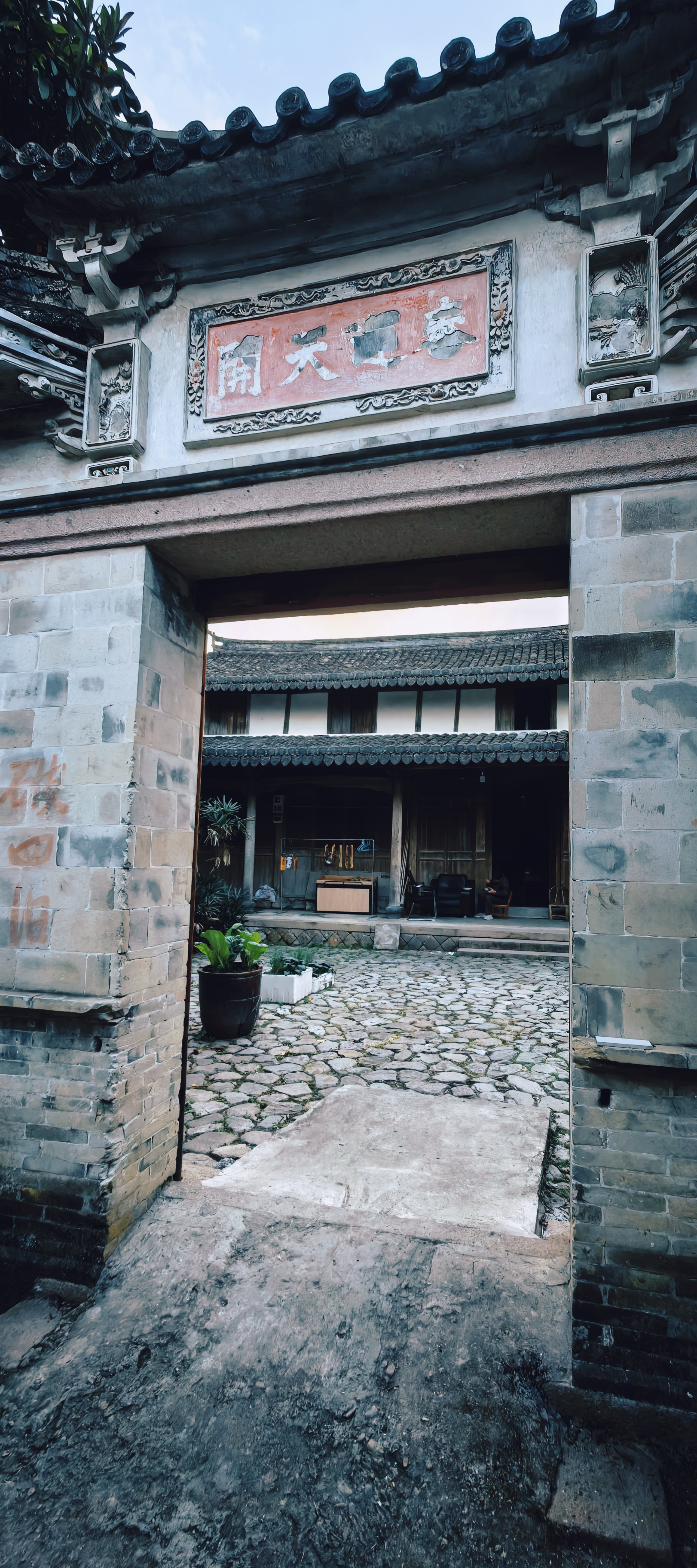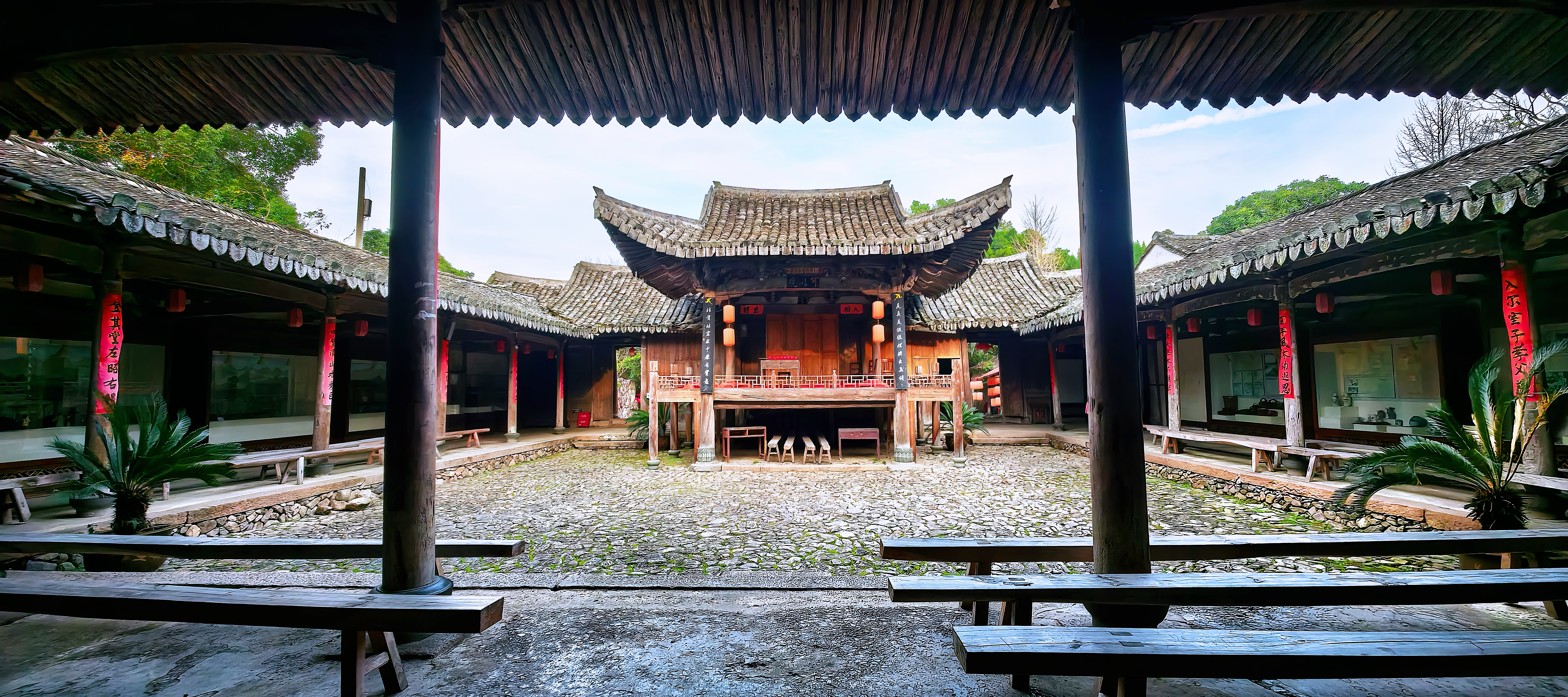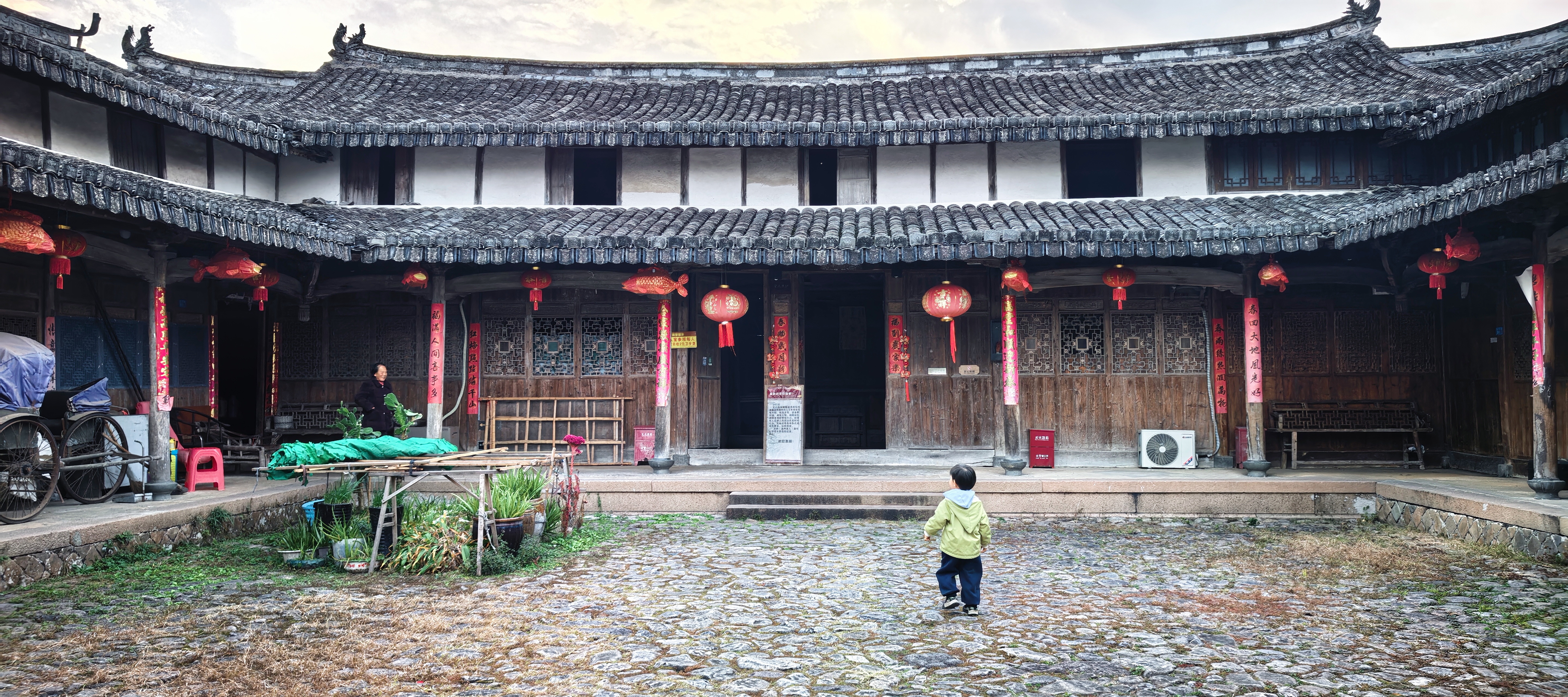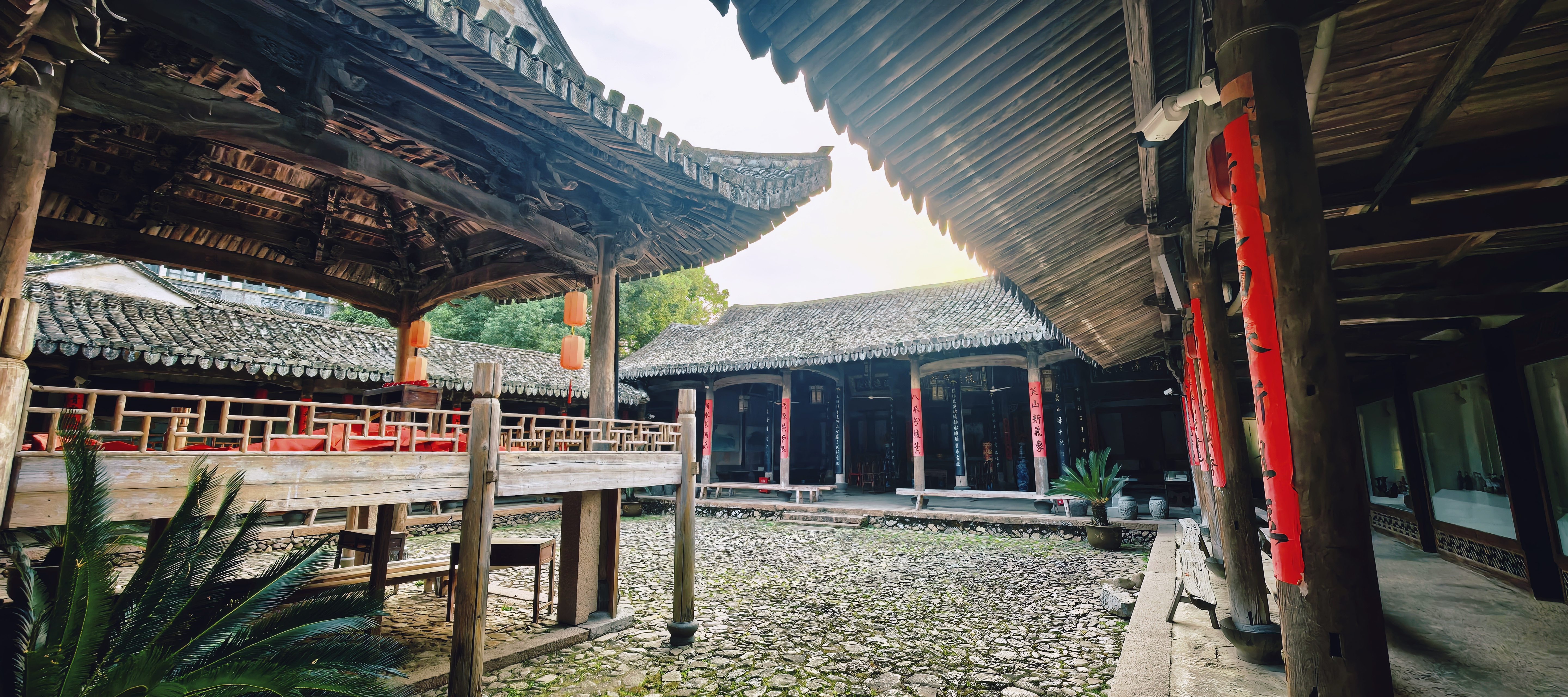 进东门北侧,便是陈氏大宗祠,它是古村建筑的精华所在。祠堂格局严谨,院内大戏台雕梁画栋,飞檐下的雕花在光影中更显精致,仿佛还能听见当年的丝竹之声与市井喧嚣。