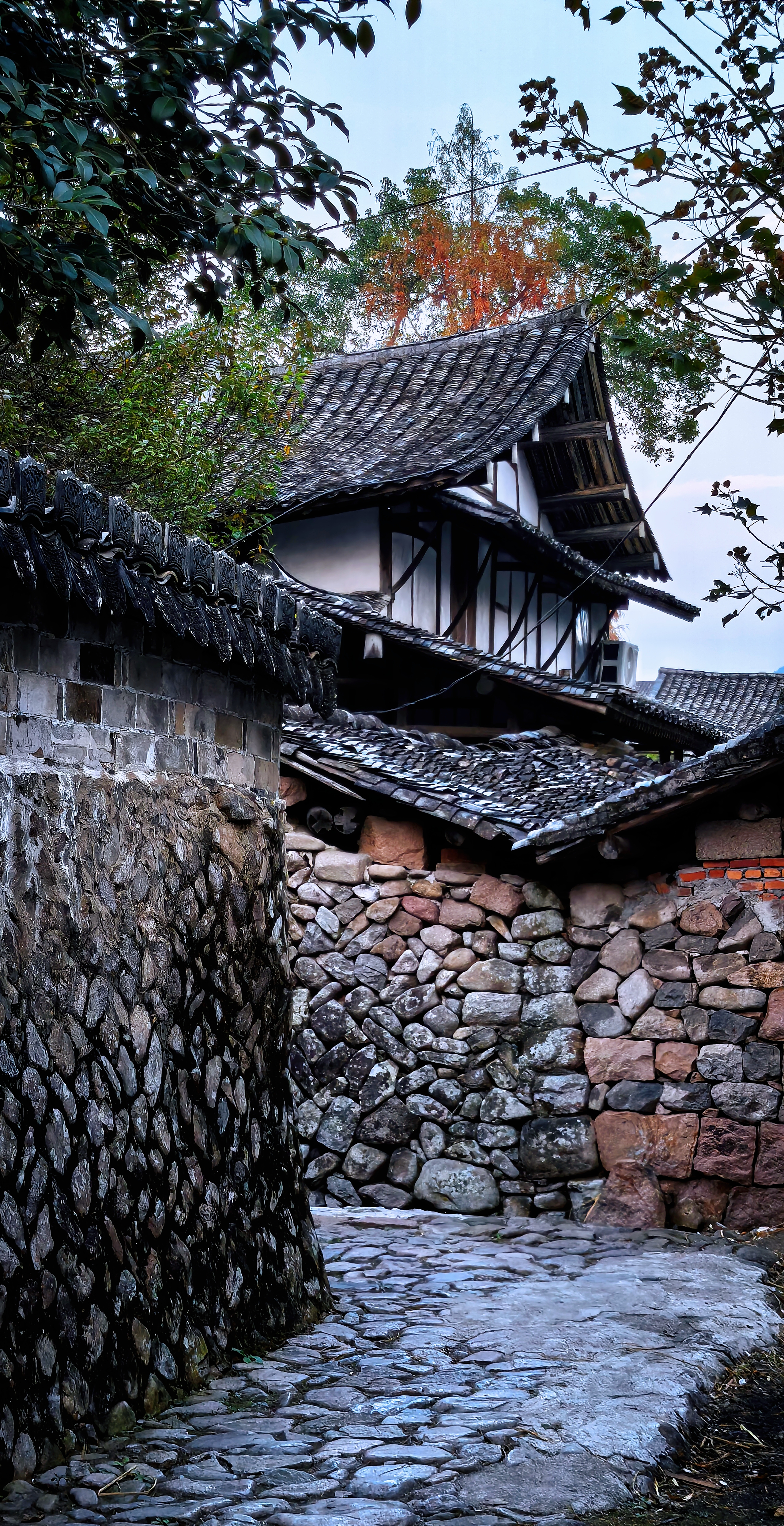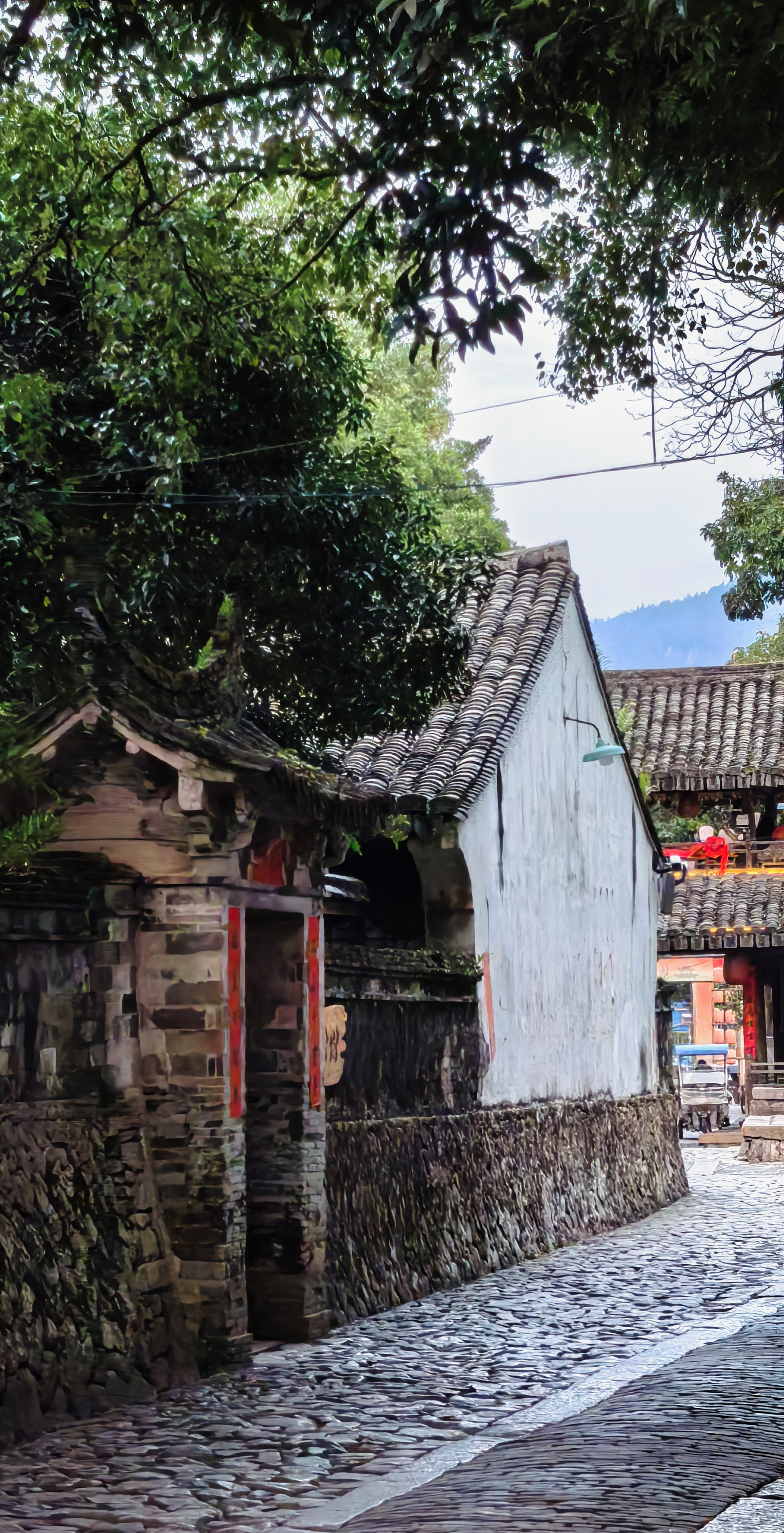 踏入村东门,脚下便是笔直的鹅卵石路,这条由东向西的如意街就是村里的中轴线。它在晴日里泛着温润的光泽,串联起一座座老宅深院。四周是卵石砌成的寨墙,整座村落呈正方形,坐西朝东,像一座藏在青山绿水间的小城堡。