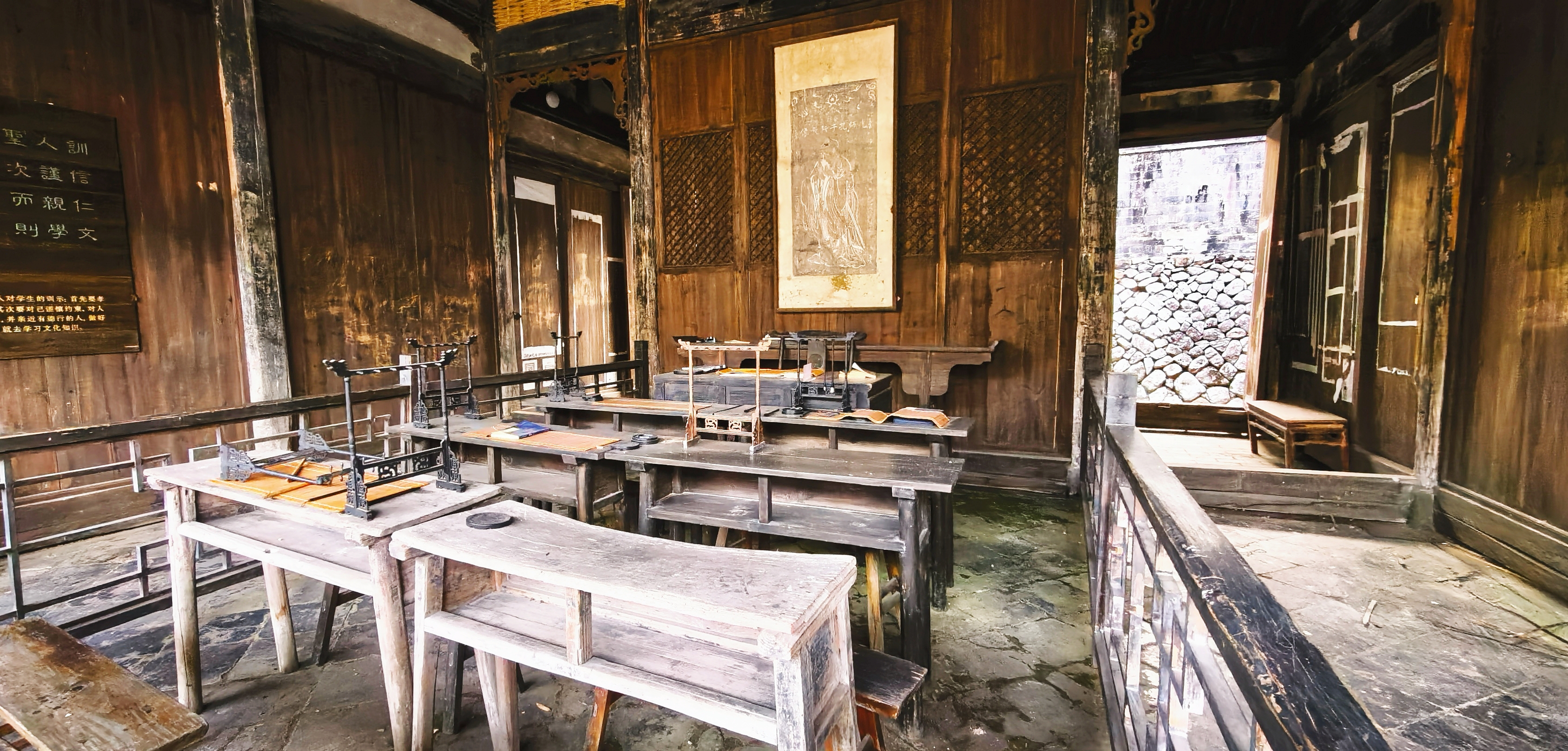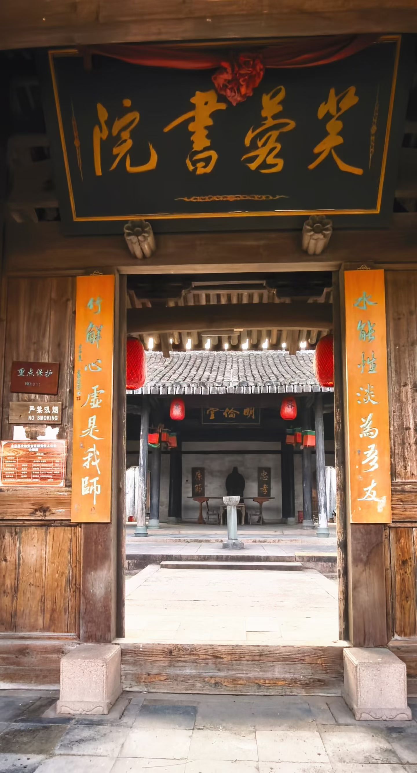 过了芙蓉池便是芙蓉书院,这座明代古书院,泮池、仪门、杏坛、明伦堂依次排列,规制正统。