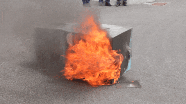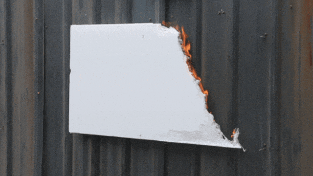 模拟使用聚氨酯泡沫的企业冷库在遇到动火作业时,火花喷溅到保温材料上出现的情况。通过实验可以看到,电焊火花掉落在聚氨酯泡沫材料上后,迅速燃起明火并伴随大量黑烟,一分钟不到火势逐渐变大,引燃墙面保温材料。
