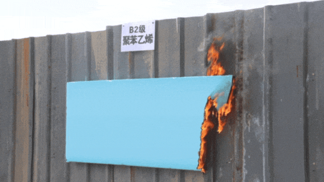 B2级材料(聚苯乙烯)被明火炙烤后,会发生燃烧,火焰传播速度较快,产生熔融变形滴落,滴落物在地上持续燃烧。