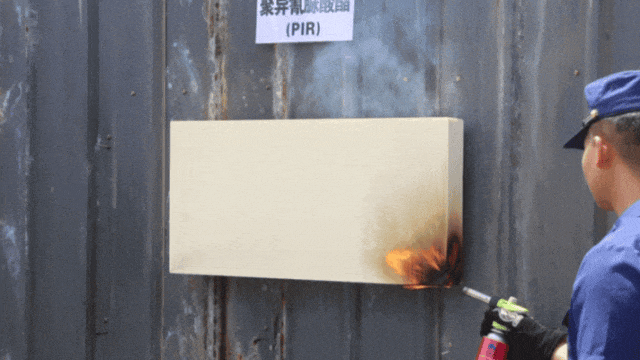 B1级材料(聚异氰脲酸酯)被明火炙烤后,会发生燃烧,离开明火后会立即熄灭。