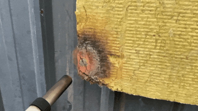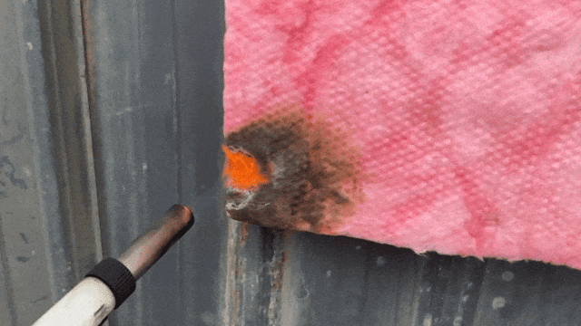 A级材料(玻璃棉)被明火炙烤后,仅表面被熏黑但并未发生燃烧,离火自熄。