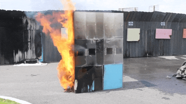 实验中,保温材料被迅速点燃,浓烟瞬间弥漫在整个模型内,火势愈演愈烈,有坍塌风险,可以反映出冷库场景真实发生火灾后,由于密闭性较好,通风条件差,火势容易快速蔓延,且人员疏散困难。