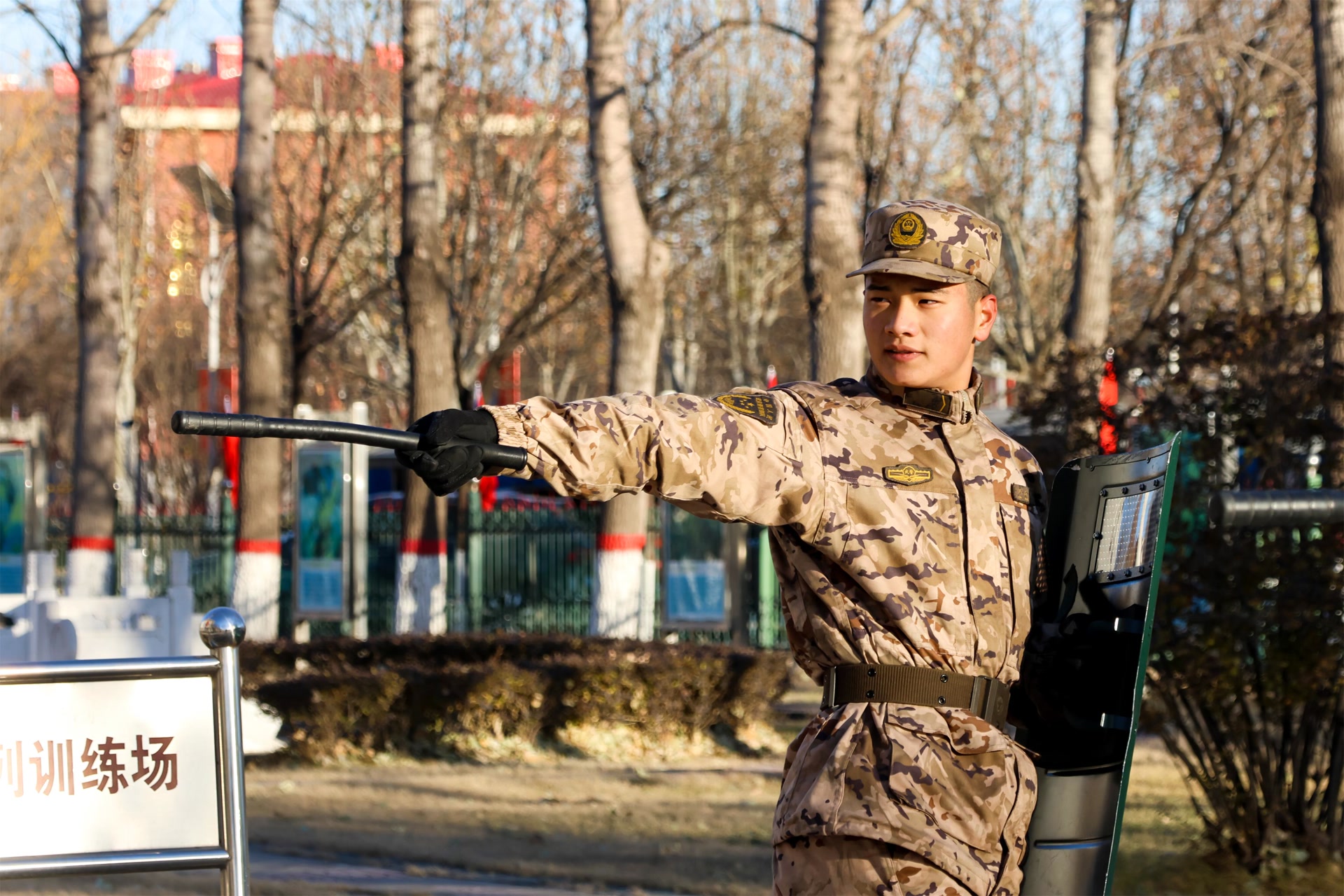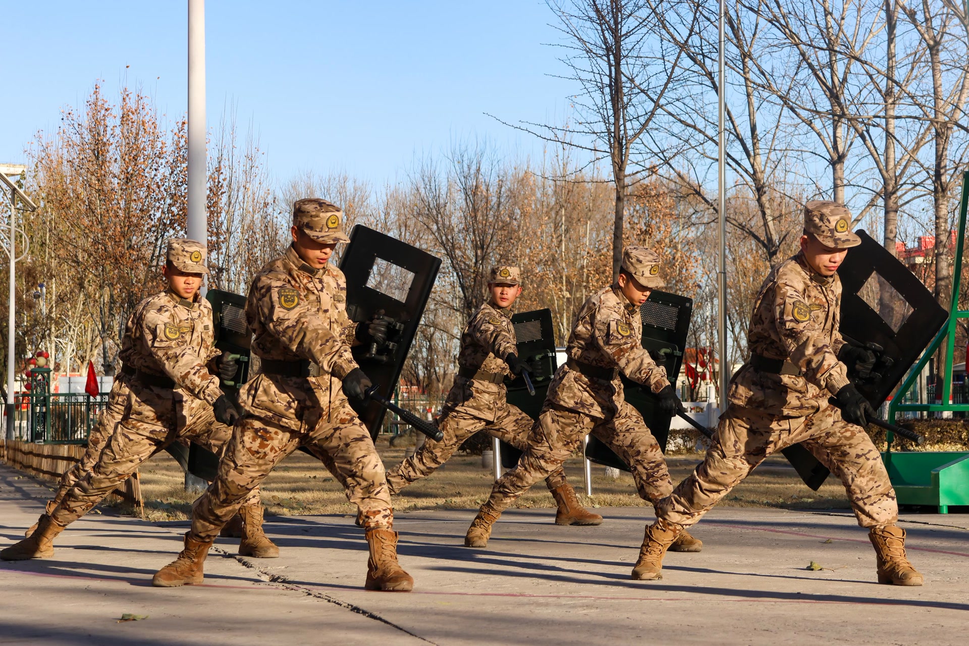 盾立如山,棍出如电。警棍盾牌训练场上,官兵们蓄势待发,一招一式、攻防兼备,以过硬本领履行维稳使命。