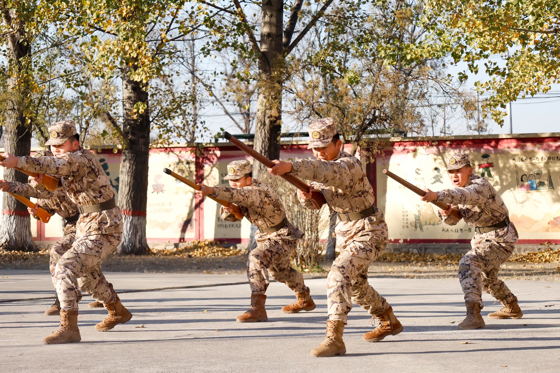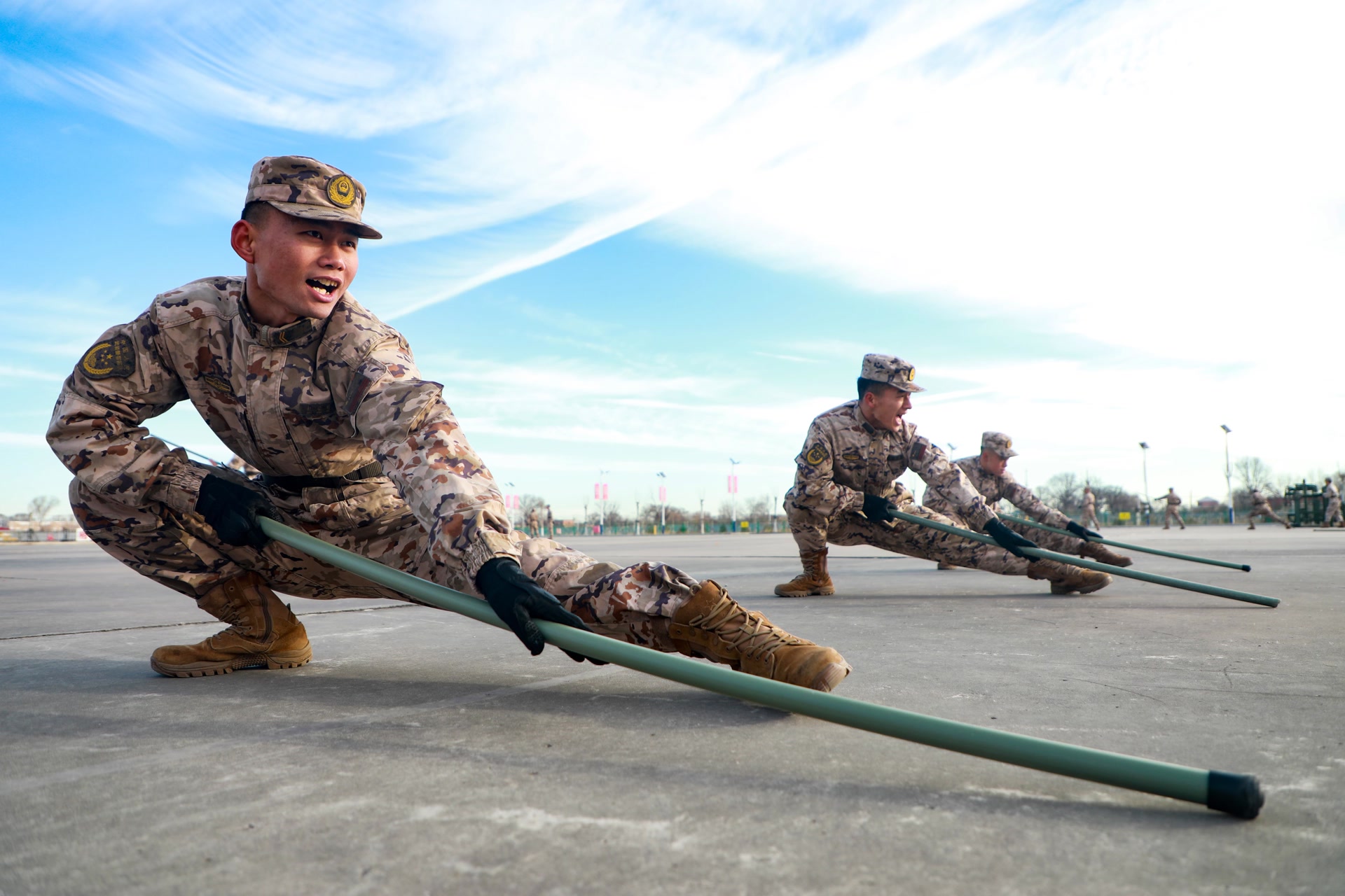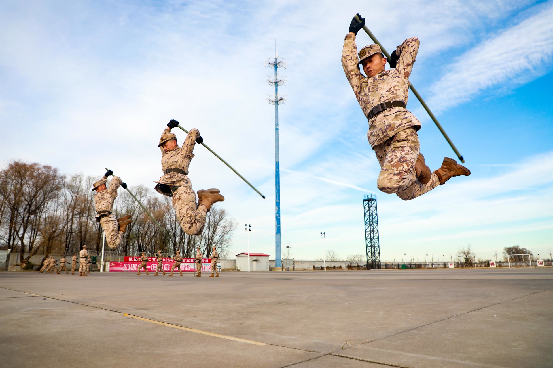 棍影纷飞,虎虎生风。应急棍训练场上,官兵们双手握棍,步伐沉稳如钟,劈、扫、戳、撩等动作一气呵成。