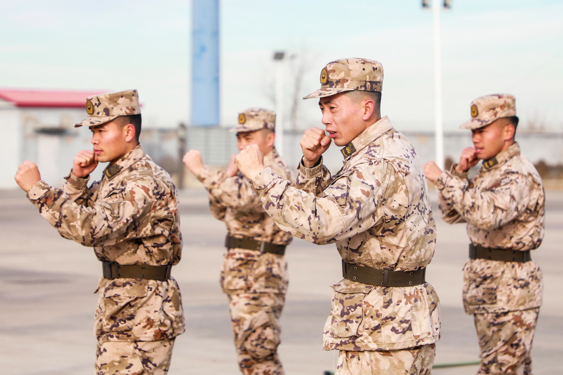 马步冲拳,直摆勾击,擒敌拳训练场同样火热。每一次出拳融合着震耳的呼喝,刚劲有力、气势如虎,拳脚起落间,磨砺克敌制胜的硬功夫。