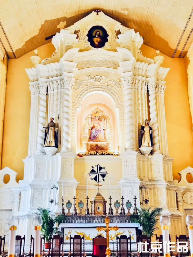 走进精致典雅的玫瑰堂教堂,绿色百叶木阁窗,淡黄色的墙壁在阳光的照耀下略带红色,使整座教堂光明透亮,熠熠生辉,温馨典雅。