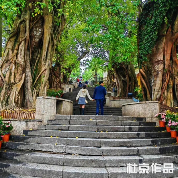 沿着嘉模斜巷一路行走,两旁老树蓊郁碧绿,夜晚如海浪般的花岗石阶梯上,投射着柔和灯光,吸引无数游人,只见一对对恋人牵手漫步,浪漫温馨。
