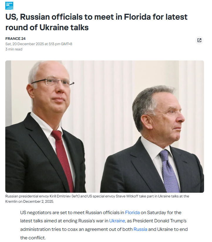 当地时间12月20日,俄总统特别代表德米特里耶夫抵达美国迈阿密。美国和俄罗斯代表即将在这座城市会晤,以期推动美方提出的俄乌“和平计划”。在这次会晤中,美方将向俄方通报最近美国和乌克兰在德国柏林谈判的情况。