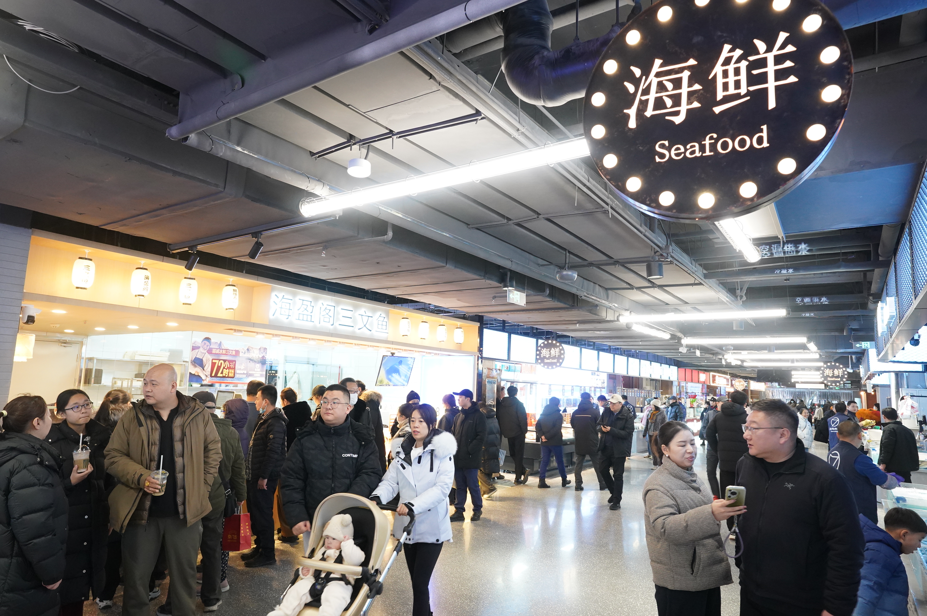 市集一层聚焦生鲜零售与便民服务,涵盖生鲜肉类、时令蔬果、特色海鲜、散装熟食、家居百货等多种品类,二楼创新打造特色餐饮集聚区,从简食快餐特色美食,应有尽有,让百姓餐桌充盈精致烟火气,为地区“一刻钟便民生活圈”建设再添助力。