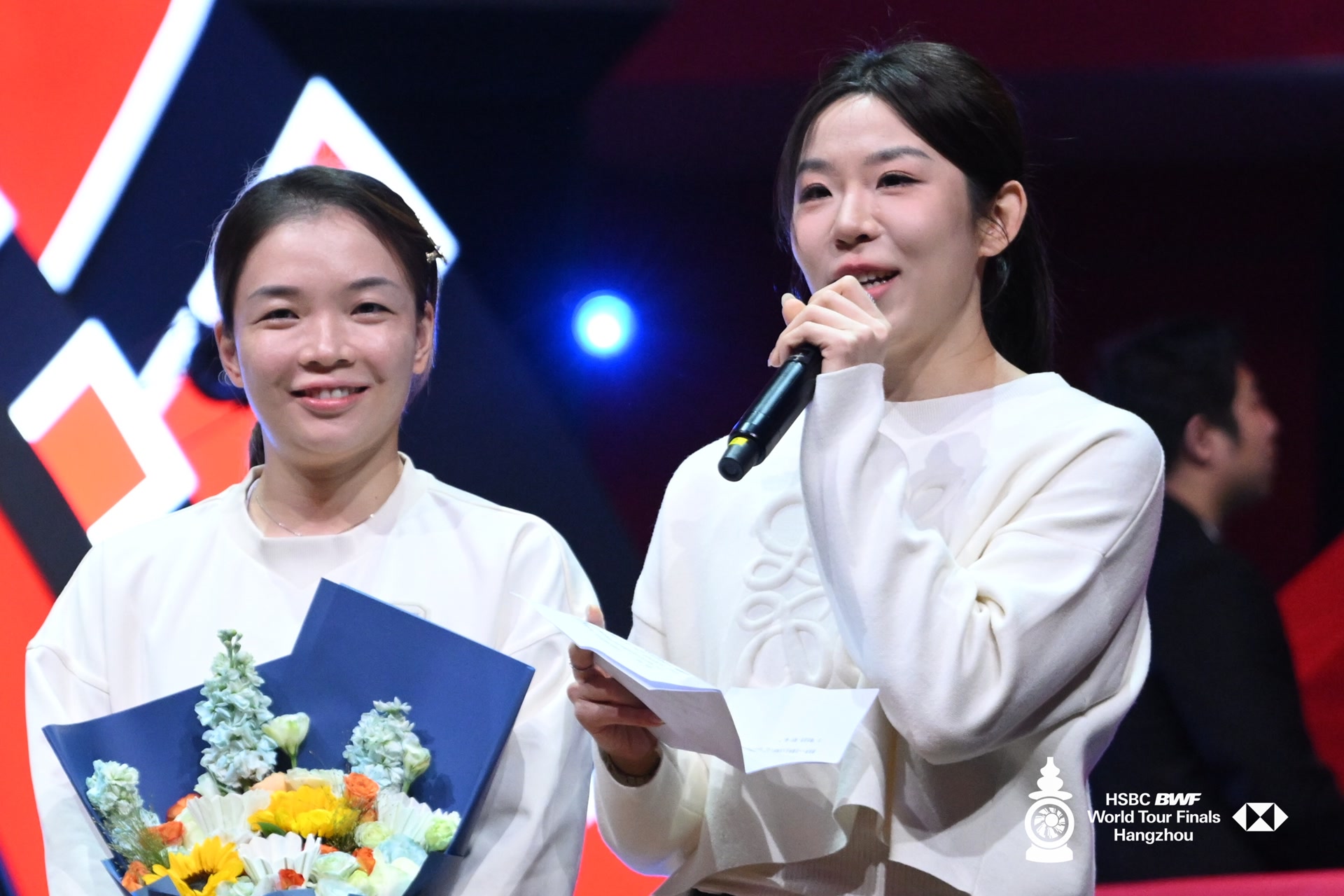 为感谢优秀运动员对中国羽毛球事业的贡献,21日,世界羽联世界巡回赛总决赛结束后,中国羽毛球协会在现场为四位世界冠军——陈清晨、郑思维、黄雅琼、刘雨辰举行了退役仪式。