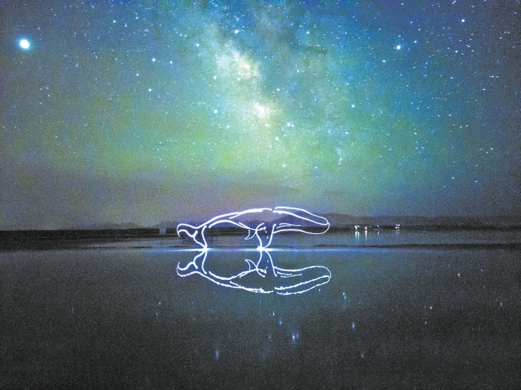 2020年的一天,王思博在青海翡翠湖畔参加活动,夜幕降临,盐湖倒映着天上的星空银河,看此美景,他灵光乍现,立刻拿起手机32秒曝光快速绘画,一条远古巨鲲划过天际,巨型轮廓倒映在平静的湖面上,美极了。虽然整幅作品线条简单,但在王思博心里绝对算得上经典之作,“它让我在技术和艺术创作上有了新的突破。”