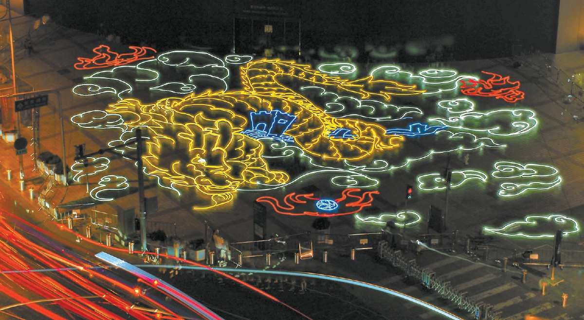 《远古巨鲲》正式开启了王思博《光绘山海经·神兽》系列作品的创作,这也是他最满意的光绘系列。不久后,同系列作品《青鸾》问世,这只创作于天津瓷房子博物馆的神兽驻足于二楼阳台昂首阔步、睥睨不凡。2021年新年之际,王思博又带着《山海经》中的炫酷神兽闪现广州,“青鸾”在“小蛮腰”前展开垂天之翼,“锦鲤”在珠江畔的莲花丛中跃出水面……之后,他又带着传说中的《山海经》神兽现身三星堆博物馆、河南博物院,让古老文明与现代光绘艺术碰撞出独特而神秘的美感。