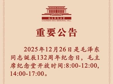 2025年12月26日是毛泽东同志诞辰132周年纪念日,毛主席纪念堂公布了当日开放时间,如下图——