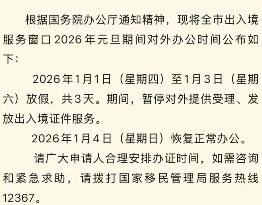 2026年1月1日(星期四)至1月3日(星期六)元旦假期期间,北京全市出入境服务窗口将暂停对外提供受理、发放出入境证件服务。