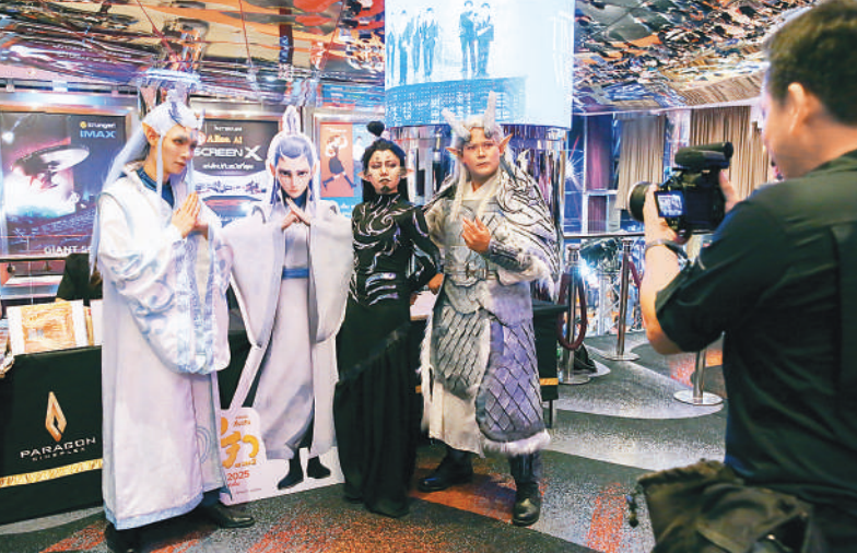 动画电影《哪吒之魔童闹海》中的角色深受网友喜爱。图为该电影在泰国曼谷的首映活动现场,人们打扮成动画角色模样与电影展板合影。新华社记者 孙玮彤摄