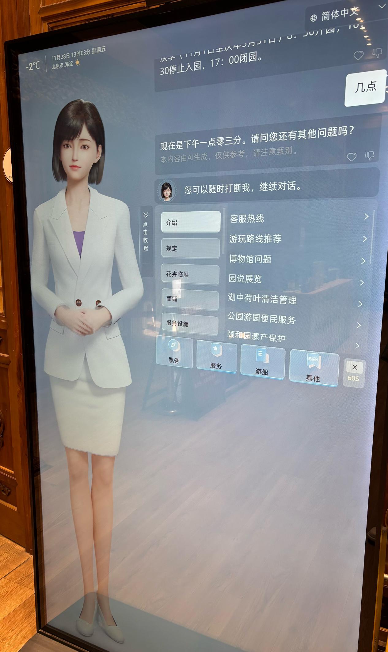 “只有两个小时逛公园该怎么走?”“从这儿到佛香阁有多远?”午后,在颐和园东宫门游客服务中心,电子交互屏上身穿白色套装的数字人“小颐”,正回答着游客们的提问。