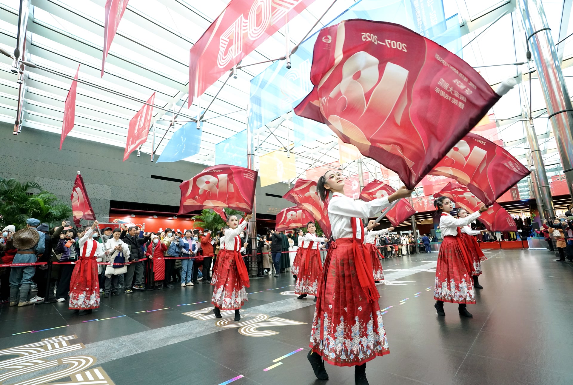 今天上午9点,伴着大鼓“迎宾十八响”,国家大剧院建院18周年公众开放日艺术节正式拉开序幕。人潮沿着北水下走廊步入这座艺术殿堂,记录着精彩演出瞬间的彩色垂幔轻盈拂动,地面上2007至2025的数字一路向前,象征国家大剧院已经走过的18载岁月。从上午到夜晚,不断线的演出和活动让艺术与观众随时相遇。