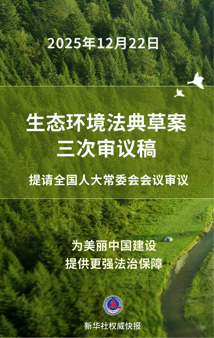 生态环境法典是我国第二部以“法典”命名的法律。2025年4月,生态环境法典草案整体亮相,初次提请审议的草案共分5编,包括总则编、污染防治编、生态保护编、绿色低碳发展编、法律责任和附则编。今年9月和10月,生态环境法典各编草案分拆为两批完成了二审。按照工作安排,将分拆审议并修改完善的各编草案重新“合体”提请三次审议。