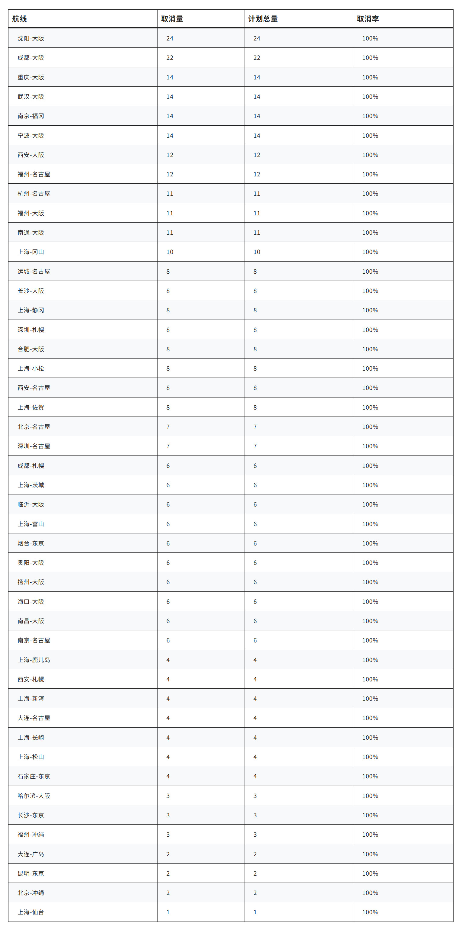 其中,上海浦东、虹桥两场共有14条航线全部取消,为取消最密集的城市;大阪关西机场成为中方航点直飞最多的日方目的地,超过10条航线停飞。