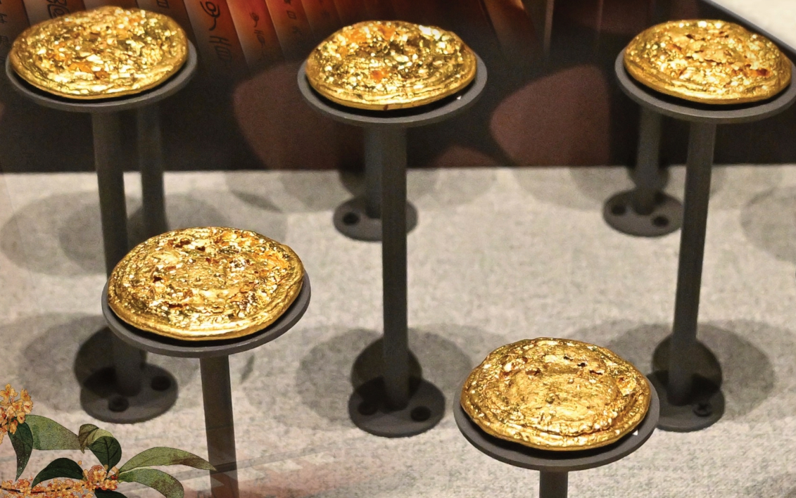 展柜中,褭蹏金(马蹄金)、麟趾金、饼金整齐排列,阳光照射下金光夺目。“马蹄金和麟趾金是汉武帝时期的特殊纪念币。”王雪告诉记者,“汉武帝在陇西发现麒麟、得到汗血宝马,在泰山发现黄金,认为是三大祥瑞。汉武帝对汗血宝马的喜爱,源于征服匈奴的雄心,便将黄金铸造成这两种形状,专门赏赐诸侯王和贵族,既是精神寄托,也是国家实力的物质反映。”这些金器底部刻有的“上”“中”“下”铭文,至今仍是未解之谜:“有说法是祭祀规制不同,‘上’祭天、‘中’祭祖、‘下’祭地;也有认为是王权等级划分,目前还在考证当中。”
