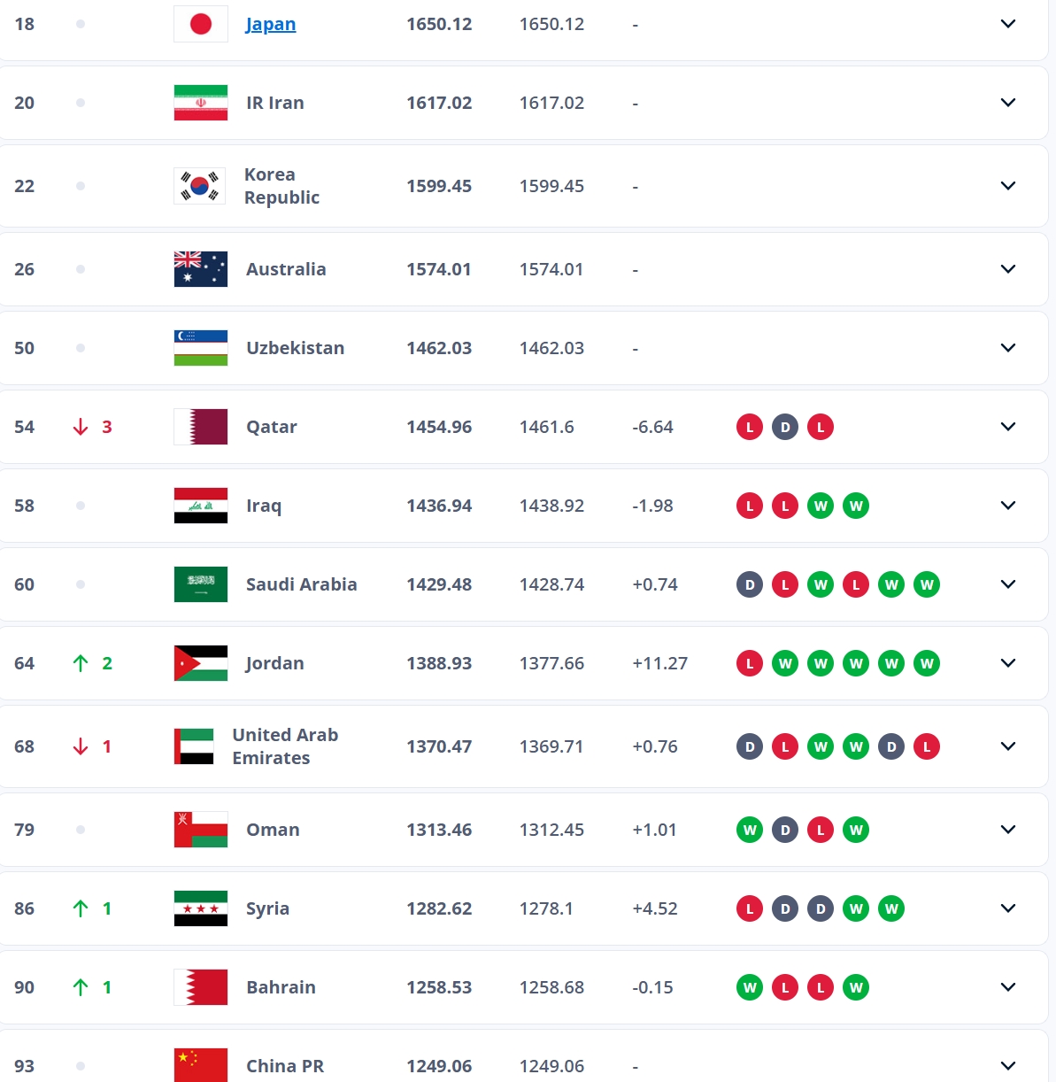 除了自身排名低,从这份年终排名中还可看出另一个问题,那就是亚洲一流球队进步明显,国足和他们的差距越来越大。此次排名中,日本(世界第18)、伊朗(第20)和韩国(第22)稳居亚洲第一梯队,与国足的排名差距已扩大至70名以上。