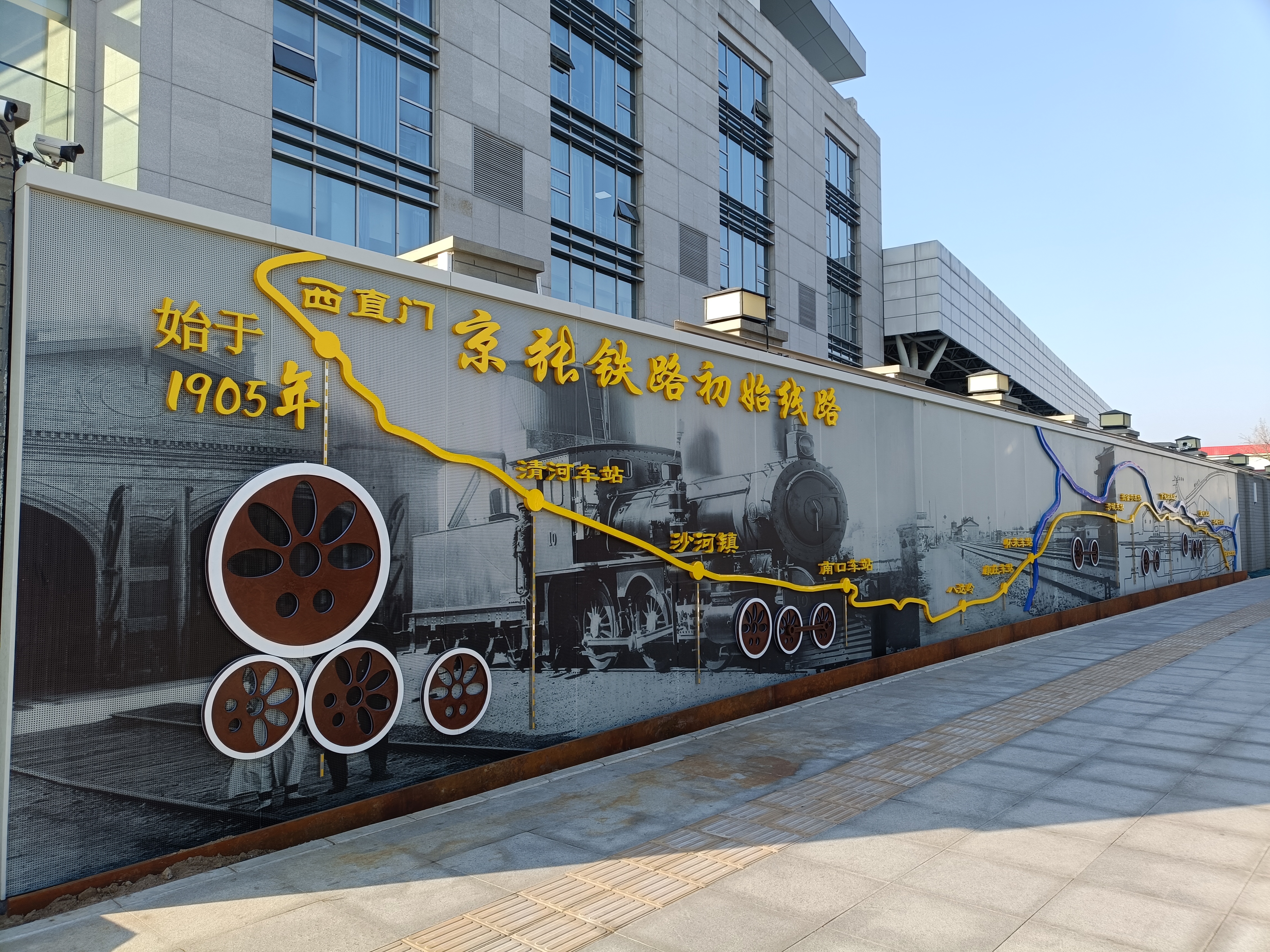 口袋公园里,30米长的京张铁路主题文化墙吸引着旅客的目光。墙面上,1905年的初始线路图与沙河镇、南口等历史站点讲述着铁路发展历史。“刚才给孩子讲了讲‘人’字形铁路的设计,他觉得很神奇。”一位带孩子候车的父亲对记者说。