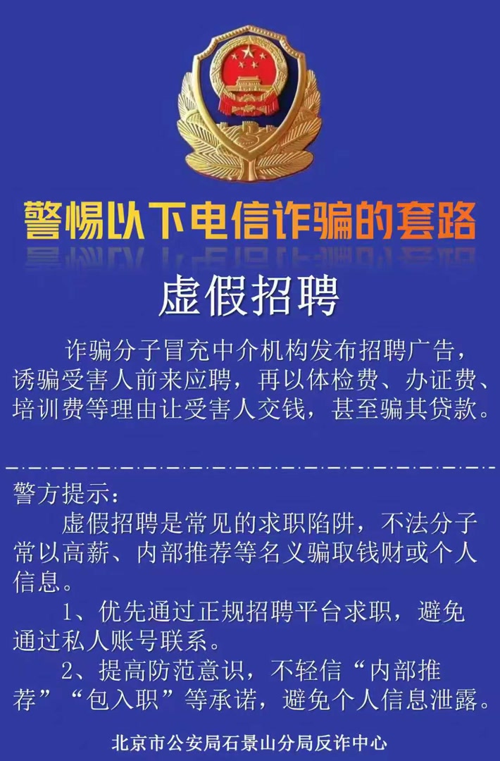 2、提高防范意识,不轻信"内部推荐""包入职"等承诺,避免个人信息泄露。