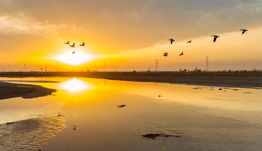 候鸟在宁夏平罗天河湾国家湿地公园上空飞翔。新华社记者 杨植森 摄