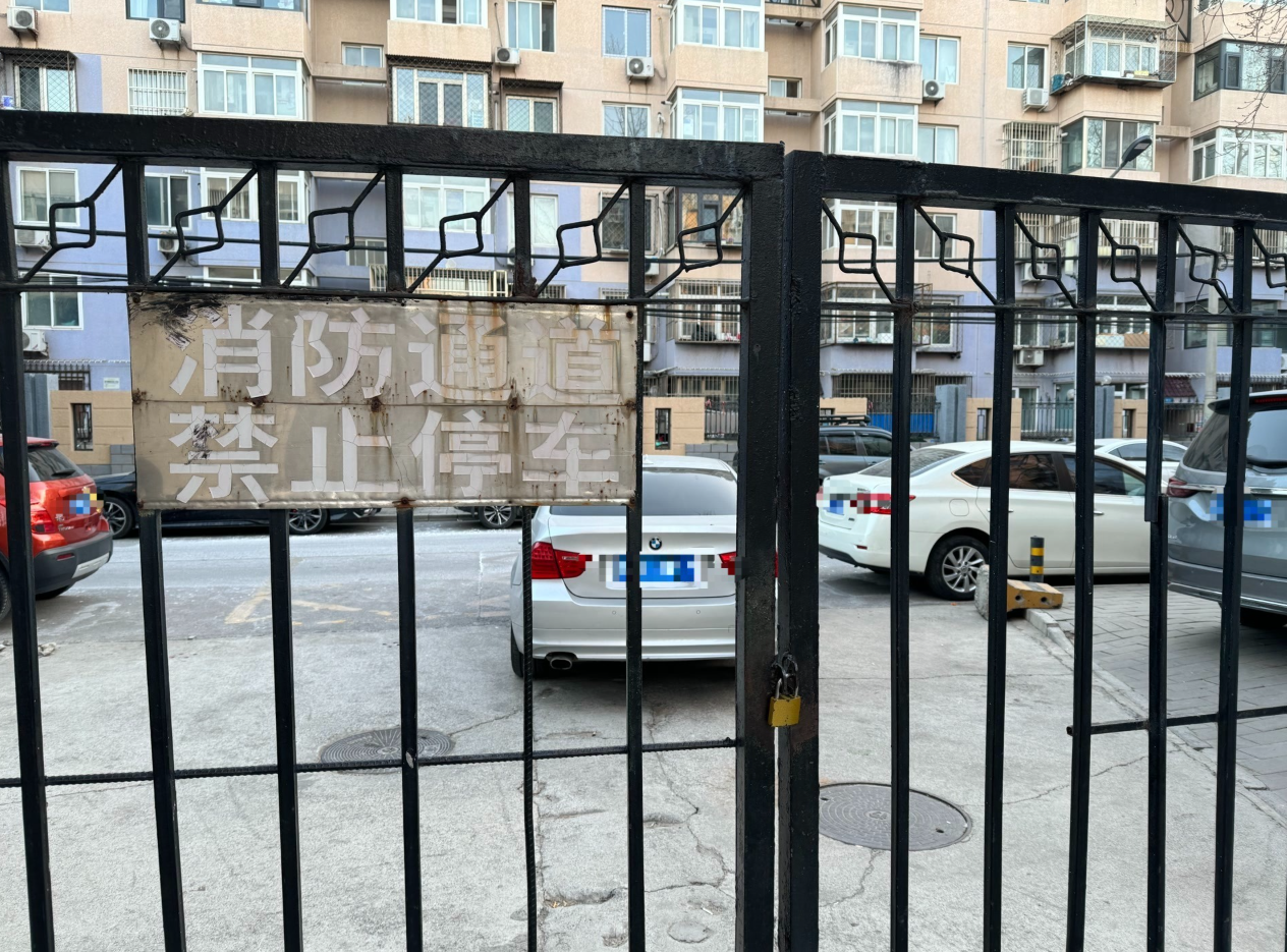 在双桥六号井小区北区,写着消防通道的几处出入口也停满了私家车,许多车上落了厚厚一层土,看起来已经许久未挪动。