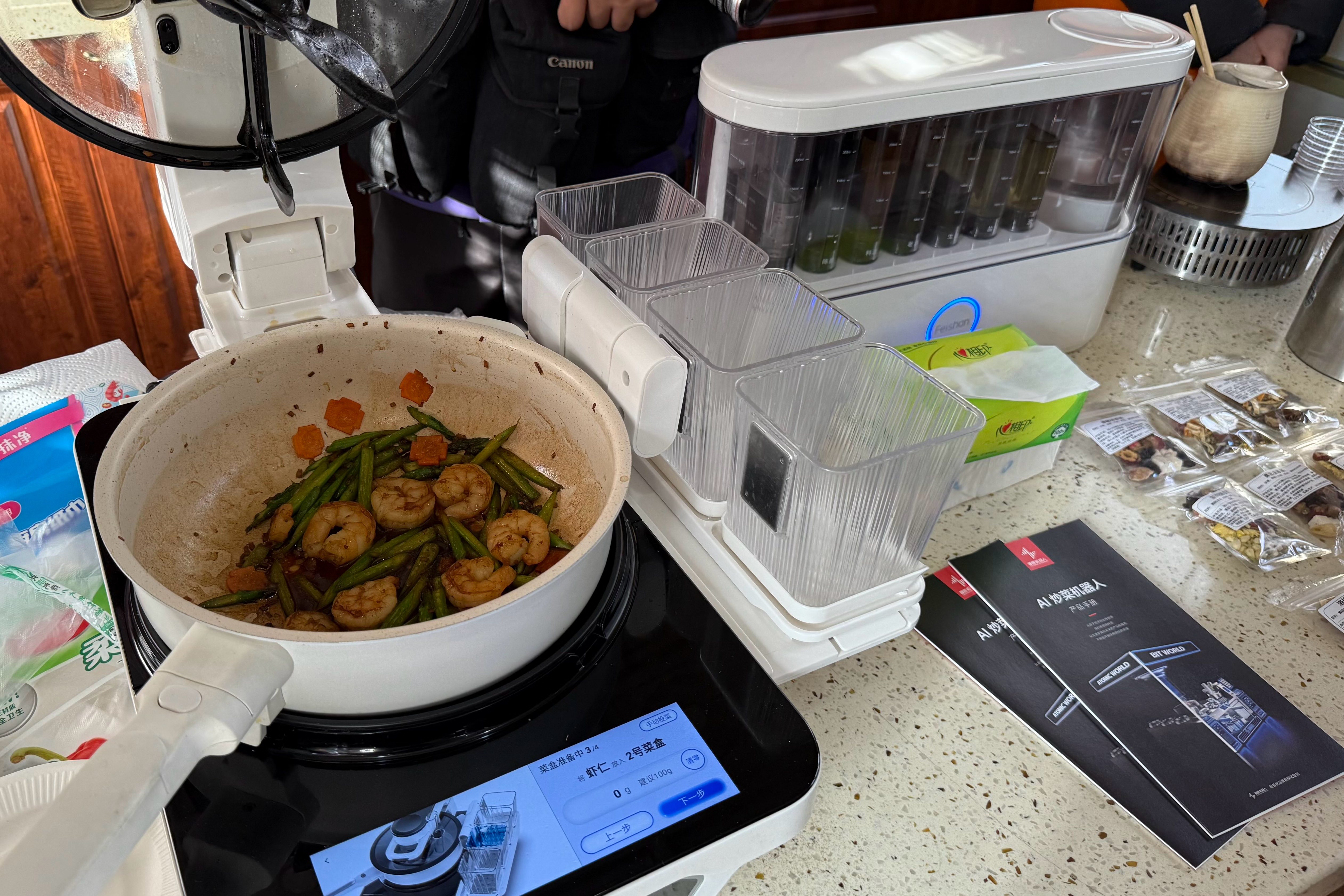 最受关注的当属居家智能服务体验区。一台炒菜机器人前围满了前来围观、品尝的居民。随着指令下达,仅用时三分钟,一道热气腾腾的芦笋炒虾仁出锅,色香味俱全。现场试吃的老人连连称赞:“吃不出来是机器人做的,咸淡正好,还很有锅气。”工作人员介绍,机器人可精准控制油盐用量,满足老年人低盐、软烂等个性化需求。