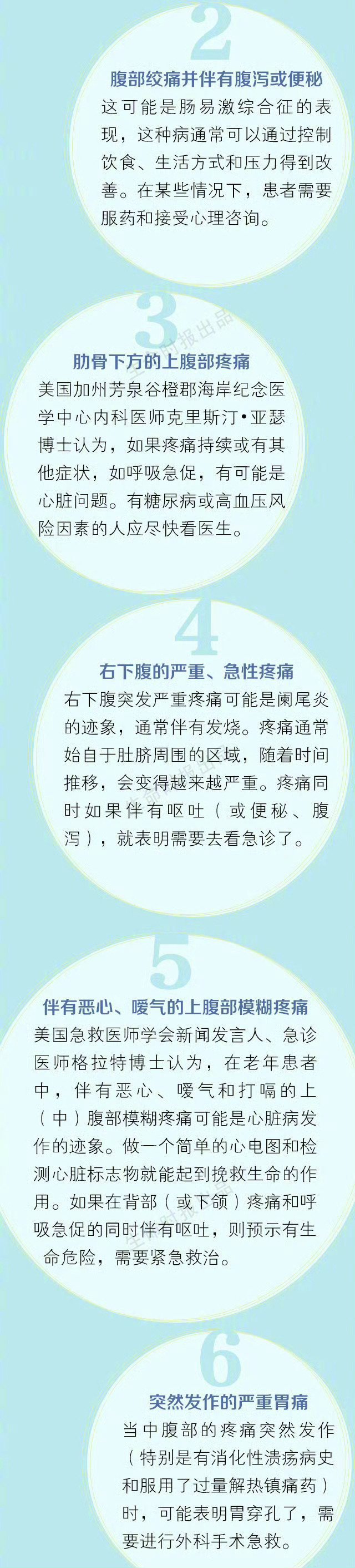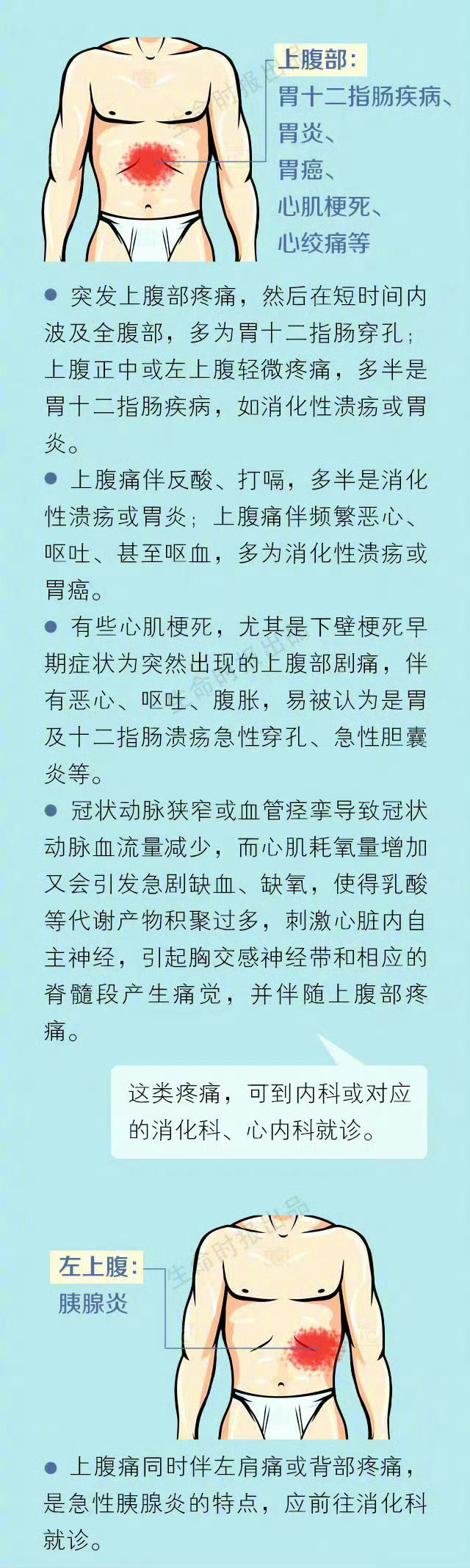 疾病的种类虽然很多,但不少器官出现异常时,常常会在同一个位置有所表现,这便是“腹部”。医学上,肚子疼几乎涉及了各科疾病,有些致命疾病的首发症状也时常表现在腹部,比如心梗、主动脉夹层。戳图,了解不同部位、不同性质的腹痛,分别可能是哪里出问题了。