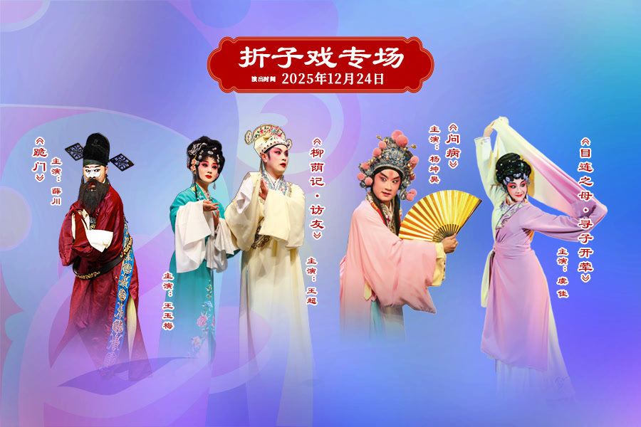 12月24日,折子戏专场汇聚四川省川剧院的《问病》、成都市川剧研究院的《访友》《跪门》和成都市文化艺术学校的《寻子开荤》4出经典折子戏。其中《跪门》源自传奇川剧《绨袍记》,是丑角艺术为核心的代表性剧目。青年演员薛川将展现甩水发、膝步功等绝活。《柳荫记·访友》讲述感人至深的梁祝爱情故事,两位中国戏剧梅花奖得主王玉梅、王超联袂演绎凄美爱情。《问病》是川剧传统戏。青年演员杨坤昊融合多种行当表演技法,形成“一人三面”的独特风格,展现川剧新生代的底蕴。《目连之母·寻子开荤》始于800年前的传统戏《目连传》,后由剧作家徐棻以“故事新编”的方式改编,是梅花奖得主虞佳的“摘梅”曲目,将展现情感丰富的高腔和水袖功。