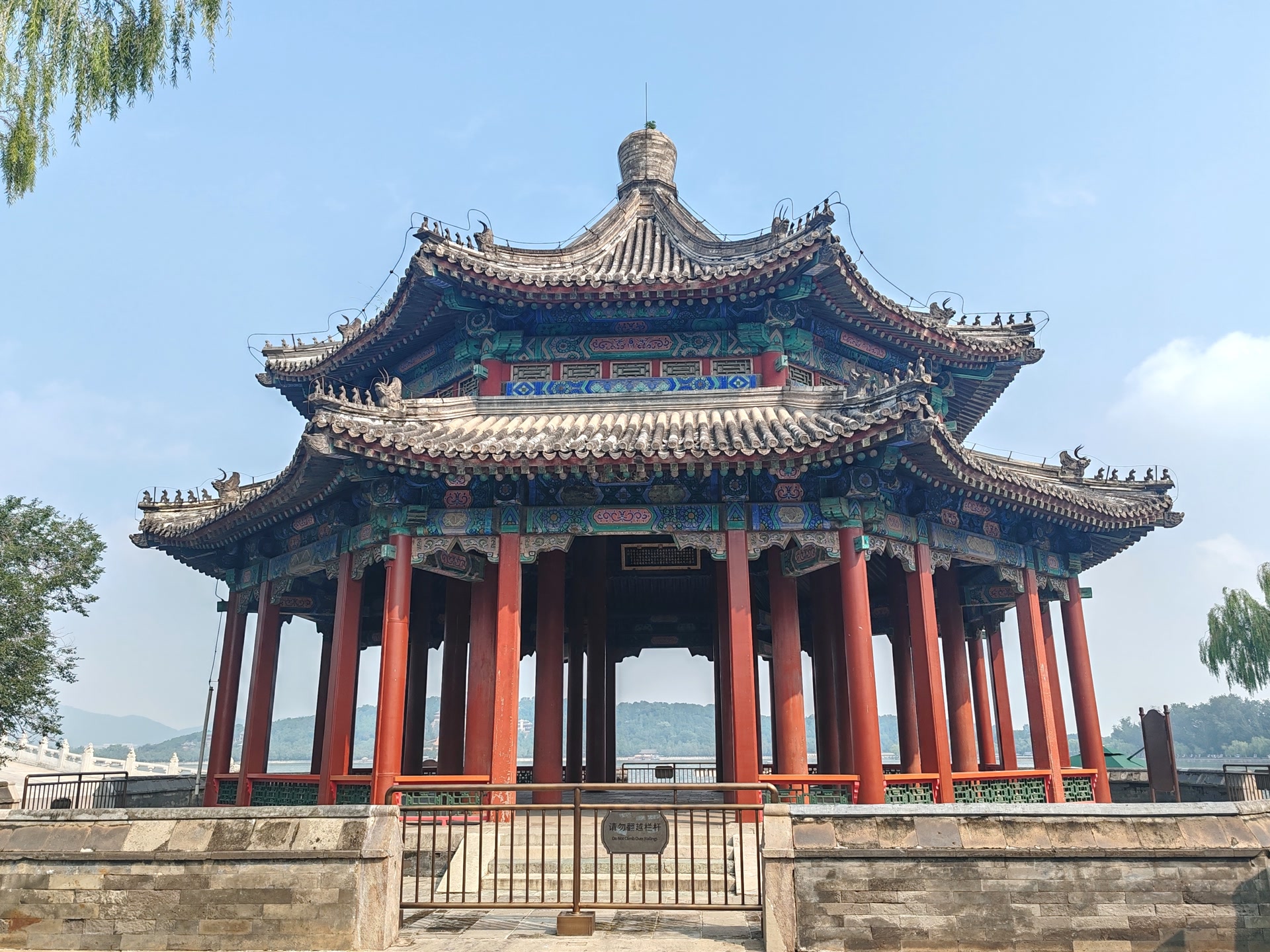 八方亭位于颐和园新建宫门以南东堤上,本称廓如亭,意为开朗空阔,虚明洞彻之亭。建筑形态舒展稳重,气势雄浑,与十七孔桥、南湖岛在空间上互相映衬。八方亭始建于乾隆十七年(1752年),其坐北朝南,平面呈八方形,每面显三间,周围有廊,重檐八脊攒尖圆宝顶,亭中共有40根柱子。八方本指东、西、南、北、东南、西南、西北、东北八个方向,而在传统建筑中八个角常与八卦方位相关联,分别对应八卦中的乾、坤、震、巽、坎、离、艮、兑,代表天、地、风、雷、水、火、山、泽八种自然现象。这种形制在风水学中常被赋予“藏风聚气”的功能,通过八角攒尖顶的设计汇聚天地之气,象征着八方来仪。