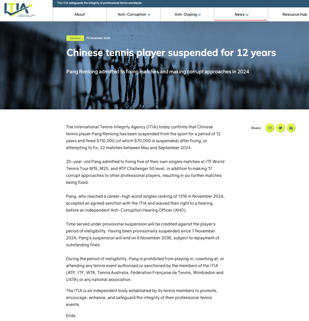 此次公告并非孤例。仅2025年至今,ITIA已公布全球范围内54名网球运动员及官员涉及腐败事件。其中,亦有中国网球运动员卷入其中。ITIA上月曾公告,三名中国球员因违反TACP而被制裁:21岁的李文夫(职业生涯最高世界单打排名1572名)、张瑾(职业生涯最高世界单打排名1285名)承认收受贿赂操纵比赛,分别被禁赛两年零三个月、罚款2万美元,和禁赛两年、罚款15000美元;23岁的陆鹏宇(职业生涯最高世界单打排名896名)则还在接受审议,被暂时禁赛。