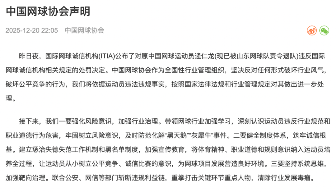 12月20日,中国网球协会也已就逄仁龙一事发布声明,坚决反对任何形式破坏行业风气,破坏公平竞争的行为,表示将依据运动员违法违规事实,按照国家法律法规和行业管理规定对其做出进一步处理。
